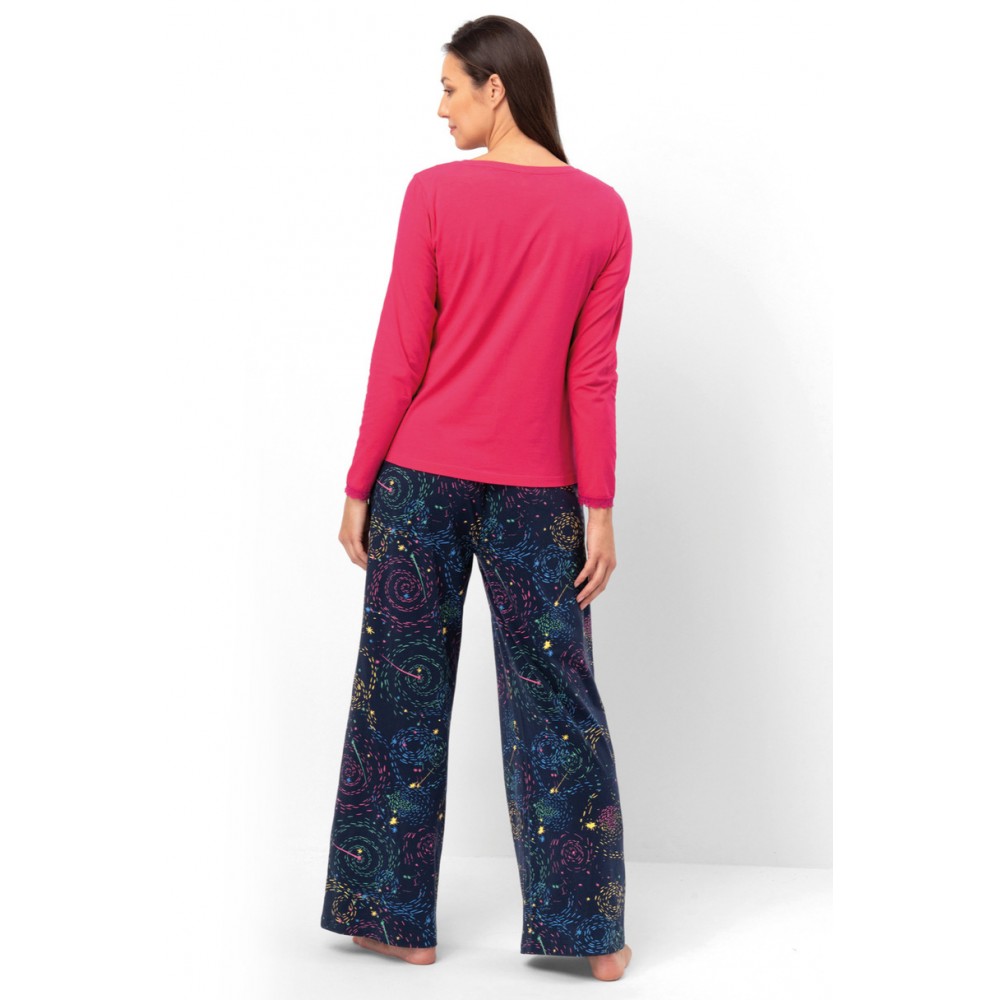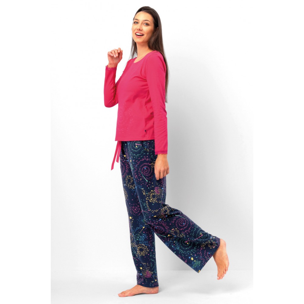 Ці жіночі піжами – ідеальне поєднання комфорту, функціональності та яскравого вигляду. Верх яскраво-рожевого кольору має довгі рукави, тонкі манжети та стриманий принт спереду, що додає нотку шарму. Низ, виготовлений з м’якої, приємної на дотик темно-синьої тканини, прикрашений химерним, барвистим візерунком, що нагадує зоряне небо або абстрактні спіралі. Вільний крій та еластичний пояс забезпечують повну свободу рухів та комфорт під час сну. Це ідеальний вибір для жінок, які хочуть почуватися стильно та комфортно вдома.
