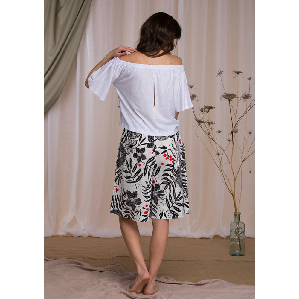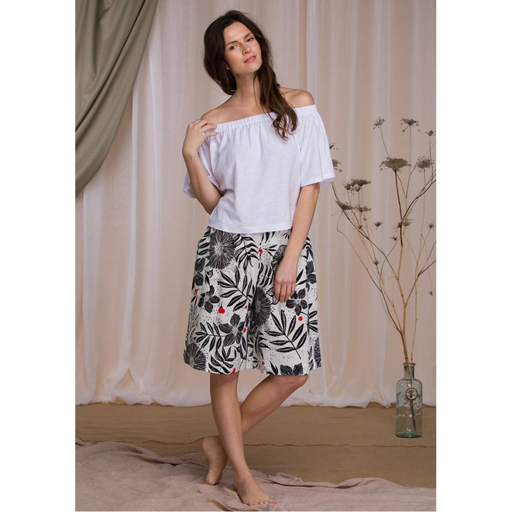 Letni komplet damski. Gładka góra z elastyczną miękką umożliwiającą regulację kształtu i głębokości dekoltu. Długość bluzki do pasa. Wygodne spódnico – spodnie w piękny kwiecisty wzór, wykonane z tkaniny lnianej. Swobodny, kobiecy krój. Naturalne włókno bawełniane, lniane i wiskozowe gwarantuje wysoki komfort użytkowania w gorące dni. Skład: bluzka: 100% bawełna, spódnico-spodnie: 55% len 45% wiskoza.
