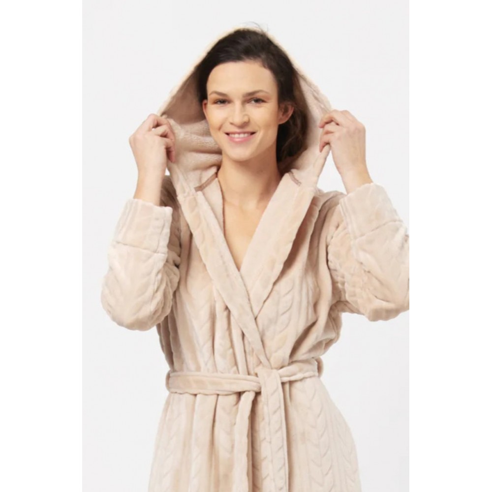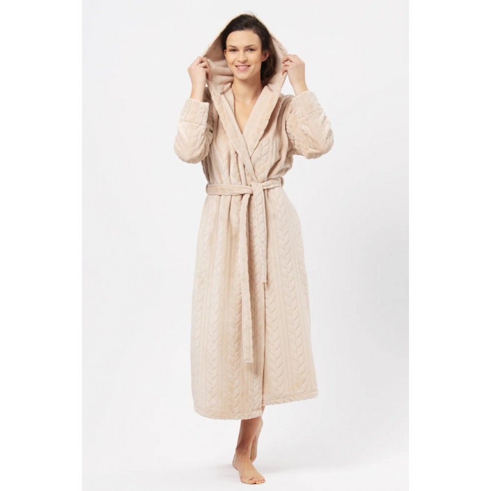 Гарний структурований візерунок з декоративною вирізаною тасьмою підкреслюється надзвичайно шовковистою та м'якою на дотик тканиною Velvet Super Soft, яка забезпечує міцність та комфорт. Крій забезпечує свободу рухів, зручний і водночас дуже практичний – він має капюшон, глибокі бічні кишені та широкий пояс. Вшиті манжети внизу рукавів можна швидко та легко закатати, тому вони не заважатимуть під час приготування ранкової кави! Привабливий, ніжний відтінок теплого бежевого робить його універсальним та елегантним вибором для будь-якої пори року. Цей дуже жіночний халат, сповнений шарму та елегантності, ідеально підходить для моментів відпочинку та радості вдома!