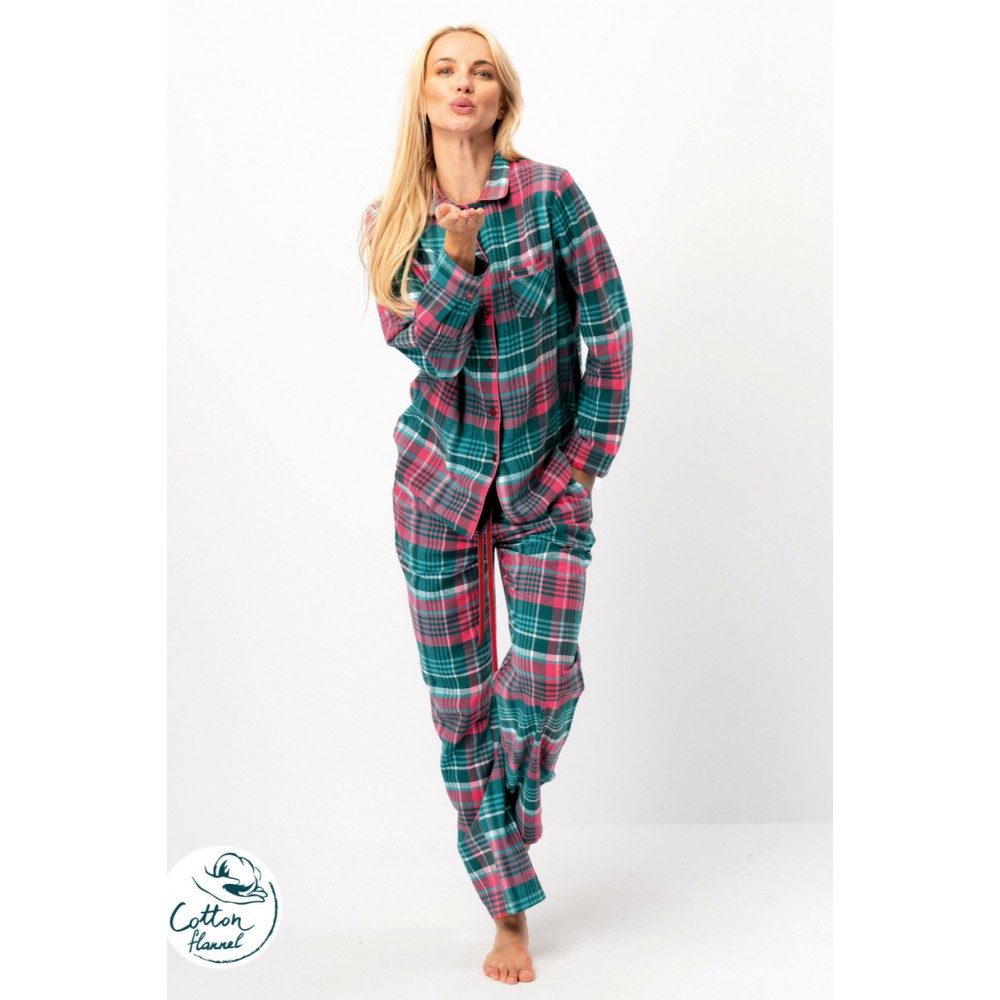 Ця жіноча піжама з м’якої бавовняної фланелі – ідеальний вибір для прохолодних вечорів та зимових ранків. Класичний топ на ґудзиках з коміром та нагрудною кишенею пропонує елегантний, позачасовий вигляд, залишаючись комфортним. Штани прямого крою з регульованим поясом гарантують свободу рухів та комфорт під час сну. Зелено-червоний картатий візерунок додає затишку, святкового шарму. Цей комплект – ідеальне поєднання функціональності, тепла та жіночного стилю – ідеально підходить як для сну, так і для відпочинку вдома.