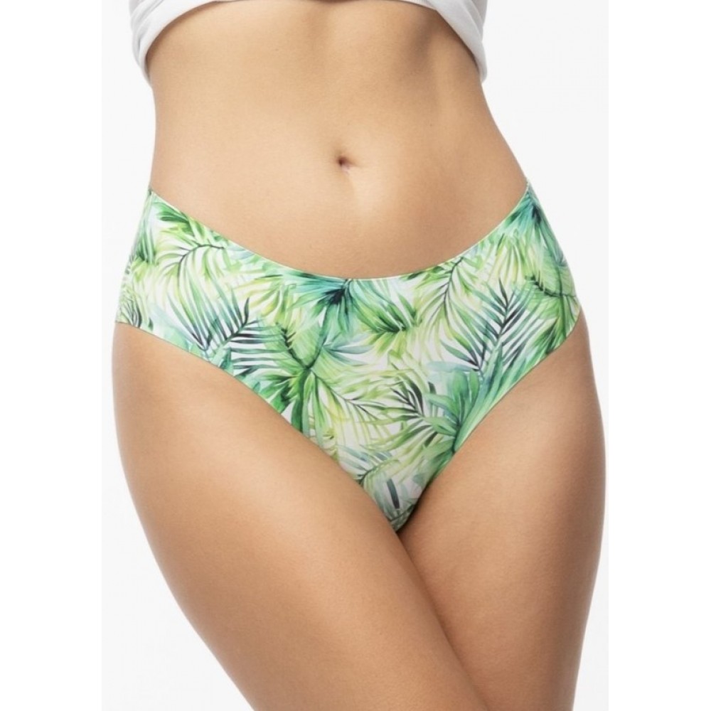 Жіночі труси класичного крою з яскравим екзотичним візерунком. Вирізані лазером, безшовні. Упаковані в подарунковій коробці. Склад: 89% поліамід, 10% еластан, 1% бавовна.
