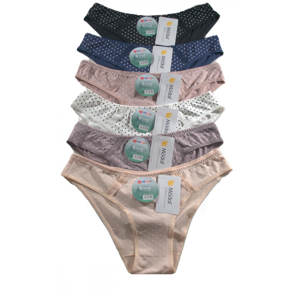 Жіночі трусики з ніжного модалу в дрібний горошок. Упаковка з 12 шт. у міксі кольорів. Розміри в упаковці (S, M, L). Склад: 94% модал, 6% еластан.