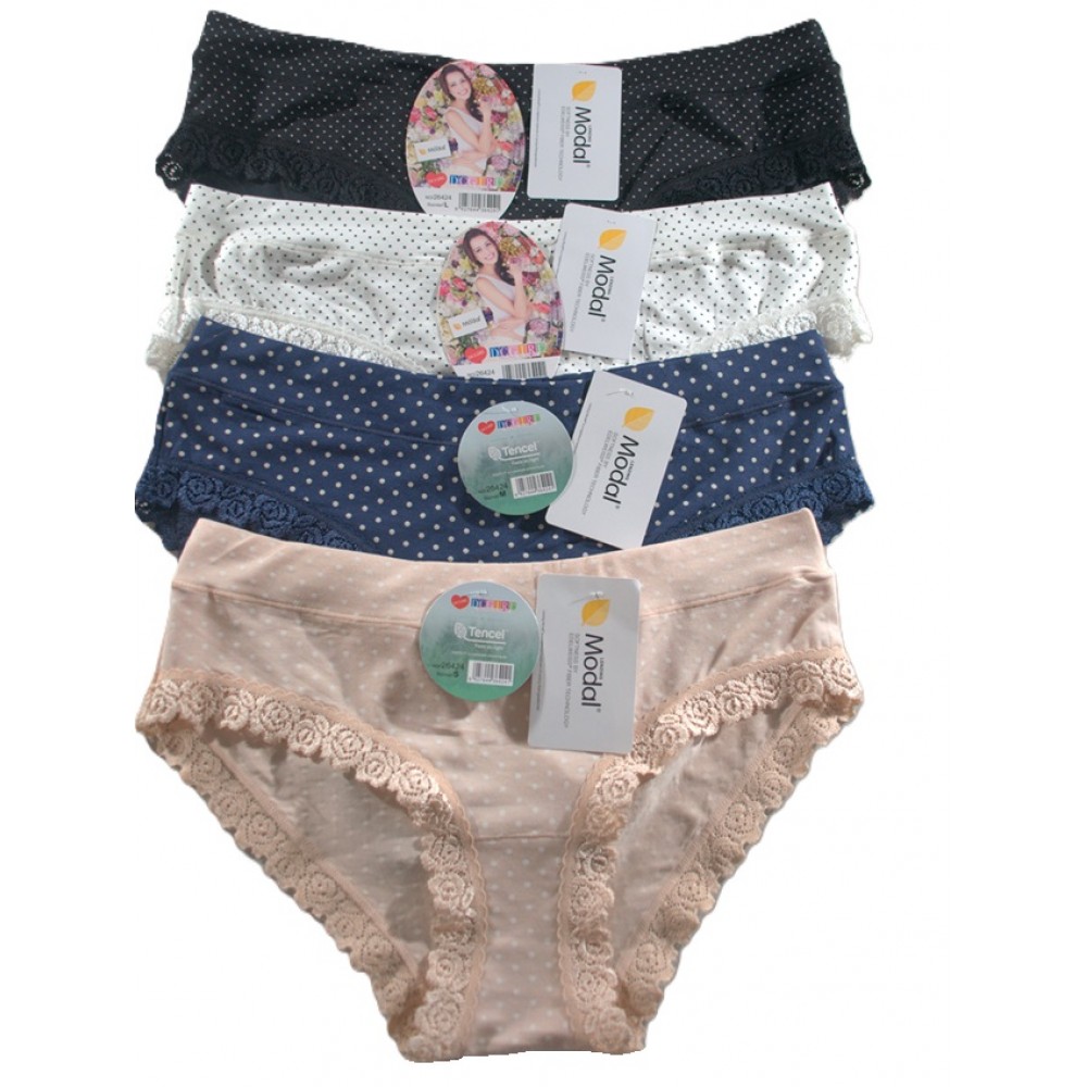 Жіночі трусики-бікіні з м'якого модалу. Передня частина виготовлена з еластичного ажурного мережива. Упаковані в мікс кольорів, 12 штук. Доступні в різних розмірах (S, M, L, XL). Склад: 94% модал, 6% еластан.