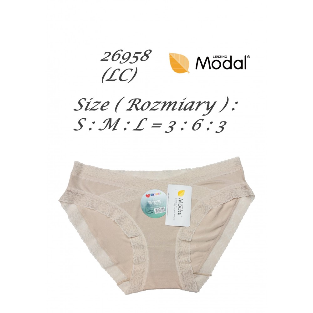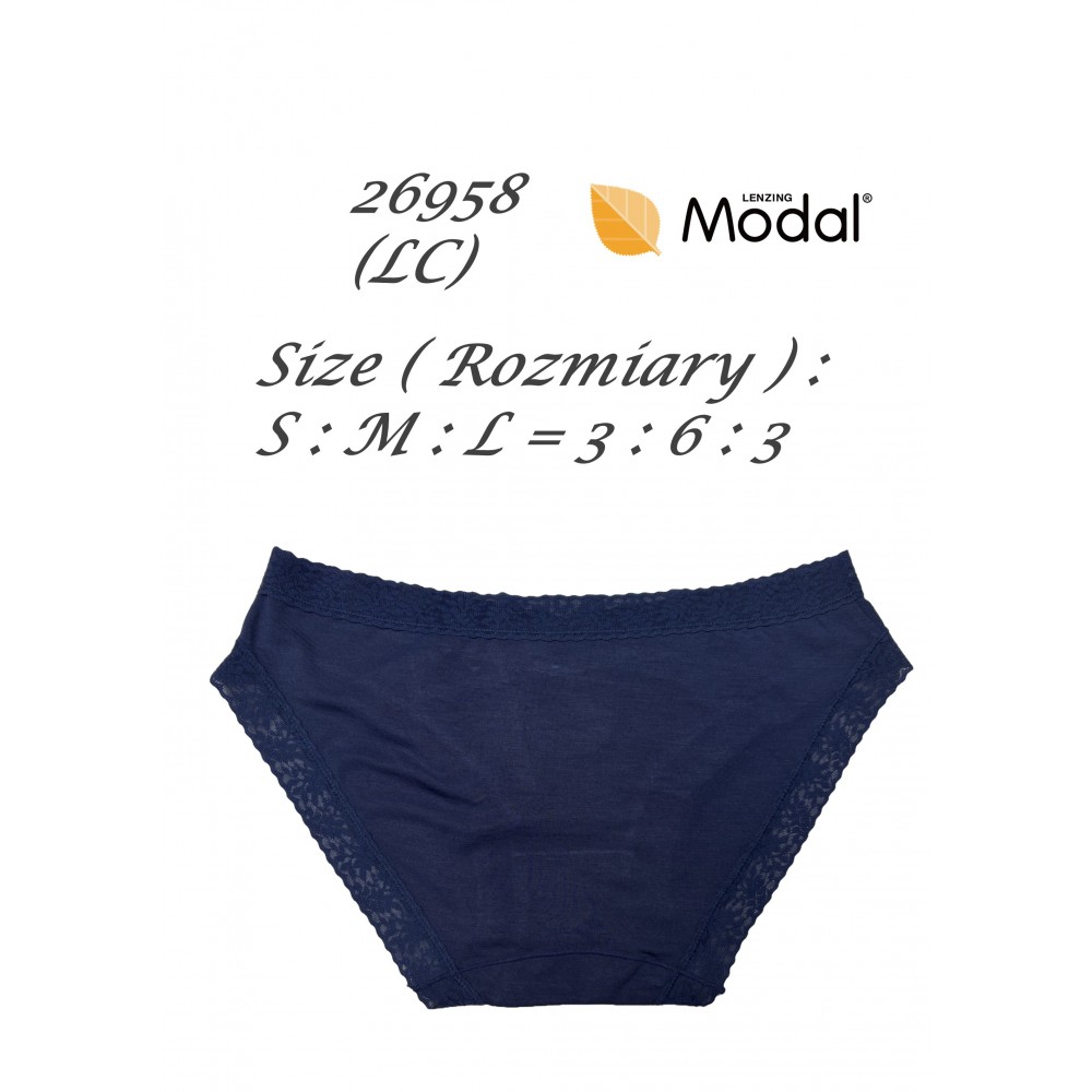 Жіночі трусики-бікіні з м'якої, зручної тканини, оздоблені мереживом. Упаковка з 12 шт. різних кольорів. Різні розміри (S, M, L) в упаковці. Склад: 94% модал, 6% еластан.