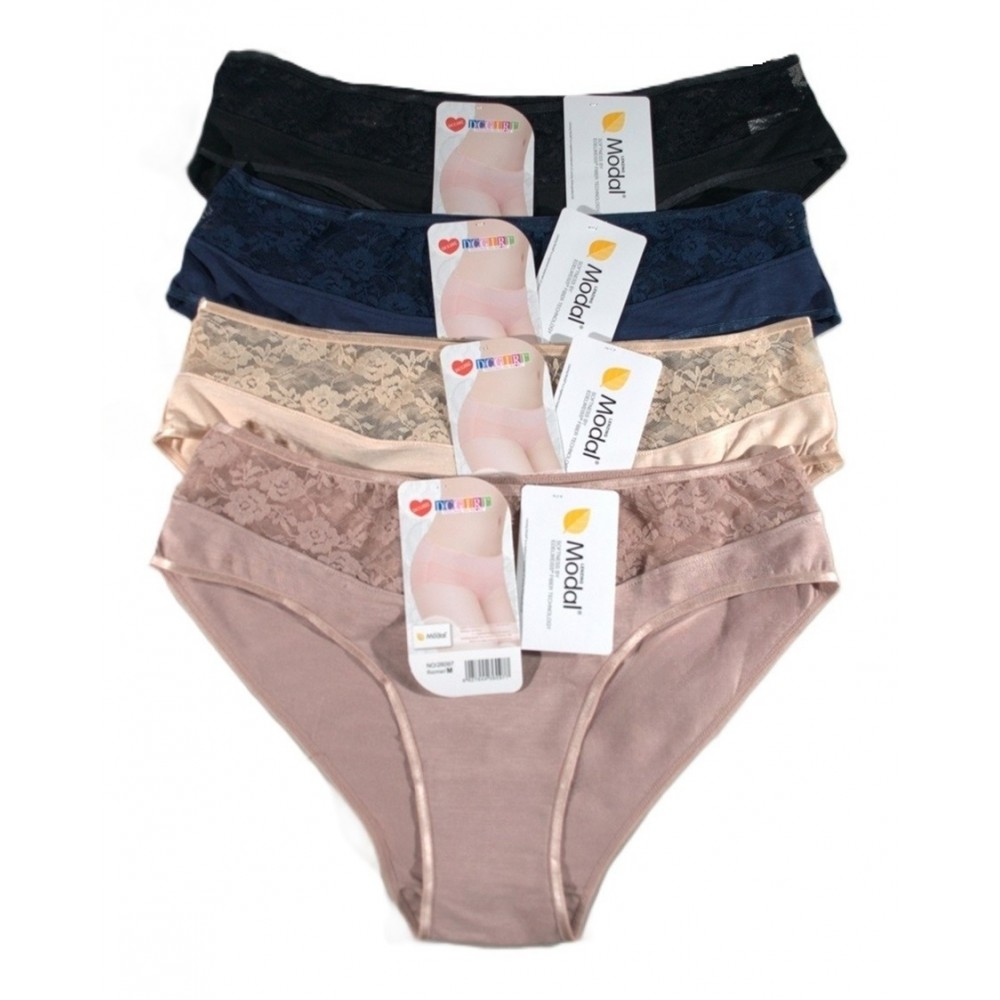 Жіночі труси з м'якого модалу. Ніжні квіткові сітчасті вставки спереду та ззаду. Упаковка з 12 штук. Різні кольори та розміри (S, M, L). Склад: 94% модал, 6% еластан.