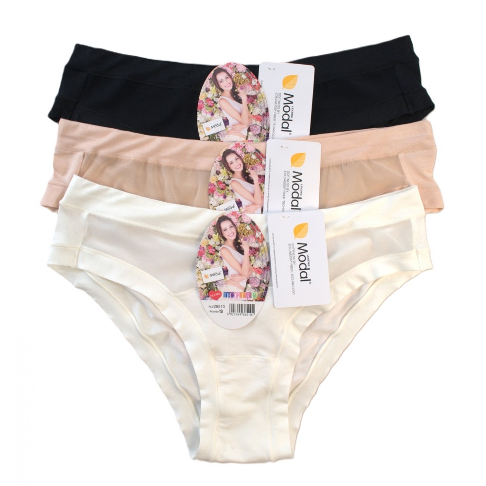 Жіночі труси з високоякісного, м'якого модалу. Гарних, приглушених кольорів, оздоблені мереживом. Упаковані в міксі 12 кольорів. Розміри в упаковці (S, M, L, XL). Склад: 94% модал, 6% еластан.