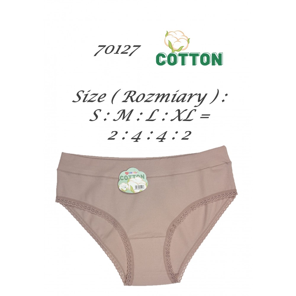 Жіночі труси з високоякісної бавовни. Ребриста тканина, оздоблена ніжним мереживом. Широкий, зручний, не стискаючий еластичний пояс. Упаковка з 12 шт. у різних розмірах (S, M, L, XL) та кольорах. Склад: 95% бавовна, 5% еластан.
