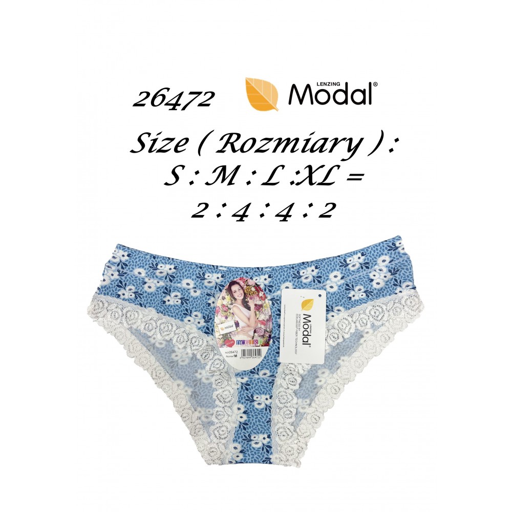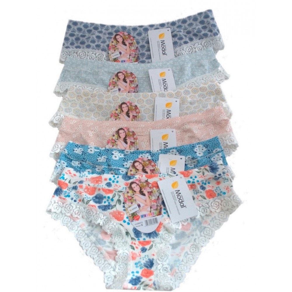 Жіночі труси з ніжного модалу. Вони ідеально прилягають до фігури. Упаковані в упаковки по 12 штук у різних візерунках та кольорах. Розміри в упаковці (S, M, L, XL). Склад: 94% модал, 6% еластан.