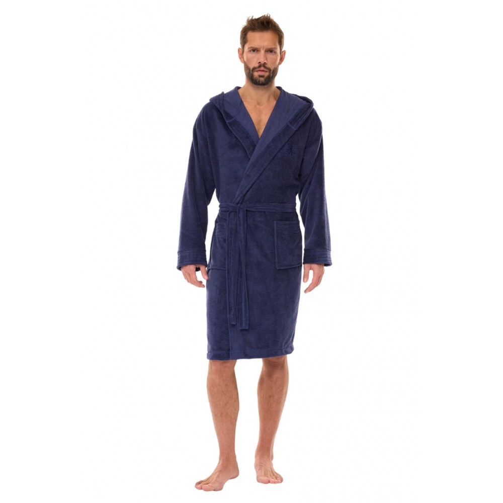 Чоловічий халат 2521 поєднує в собі елегантність, комфорт та сучасні матеріали. Виготовлений з високоякісної суміші бамбука та бавовни, він пропонує виняткову м'якість, повітропроникність та природні антибактеріальні властивості. Його капюшон та практичні кишені забезпечують комфорт, а класична довжина до колін робить його ідеальним як для ванни, так і для відпочинку вдома. Витончений вишитий логотип додає розкішного шарму. Доступний у класичному білому та елегантному темно-синьому кольорах.