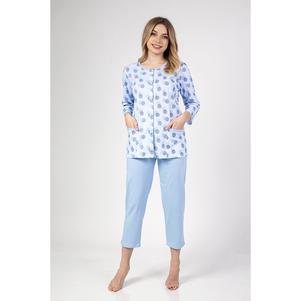 Жіночий зручний піжамний комплект з двох предметів. Блузка в горошок на ґудзиках з круглим вирізом горловини та довгими рукавами. Кишені спереду. Однотонні штани довжиною 3/4. 100% бавовна.