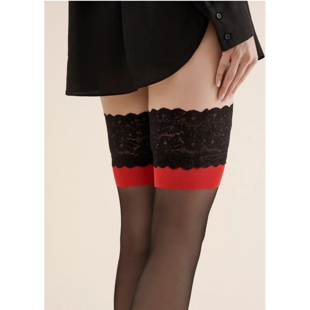 Гладкі, тонкі (20 деньє), чорні трусики-підтримки прикрашають штанини до середини стегна широкою смужкою з сексуального мережива, додаючи образу чуттєвості. Червона мереживна деталь привертає увагу. Склад: 85% поліамід, 15% еластан.