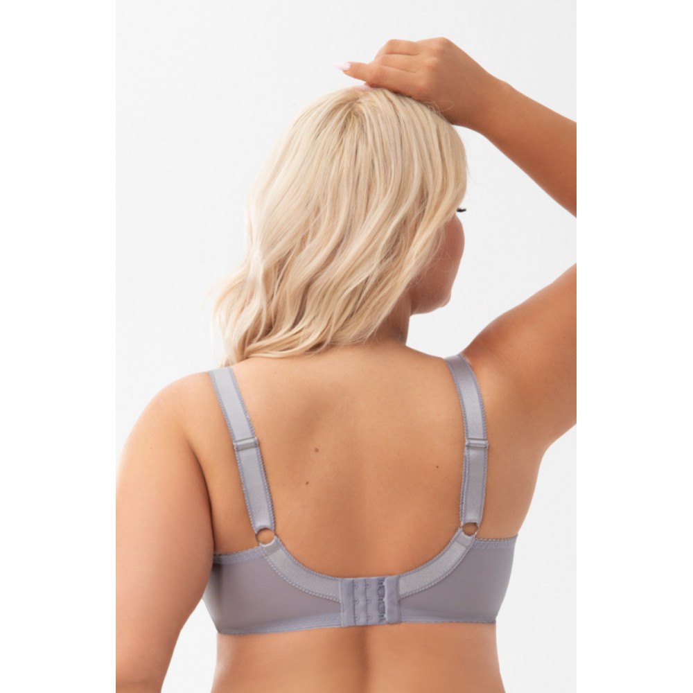 Цей м'який бюстгальтер розроблений для жінок із середньо-великими та дуже великими грудьми. Він забезпечує щільне підняття та центрування грудей завдяки трисекційним чашечкам з вишивкою на міцному тюлі. Верхній край чашечки оброблений стрічкою, яка плавно переходить у бретелі для посиленої підтримки. Спинка виготовлена з прозорої лайкри для дуже гарної посадки та підтримки. Бічні кісточки запобігають скочуванню матеріалу. Залежно від розміру, є дво- або трирядна застібка на липучках з регулюванням у трьох положеннях. Незнімні регульовані бретелі трьох розмірів завширшки, додатково посилені оксамитовою стрічкою у більших розмірах. Сріблясті металеві елементи (без нікелю).