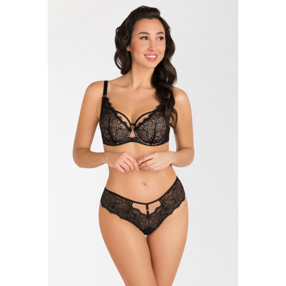 PAS OBWODU: wyprofilowany mostek z tiulu stabilnego oraz koronki elastycznej; transparentna lycra o strukturze siatki zapewniająca bardzo dobre podtrzymanie; brak fiszbin bocznych – zwiększony komfort użytkowania.