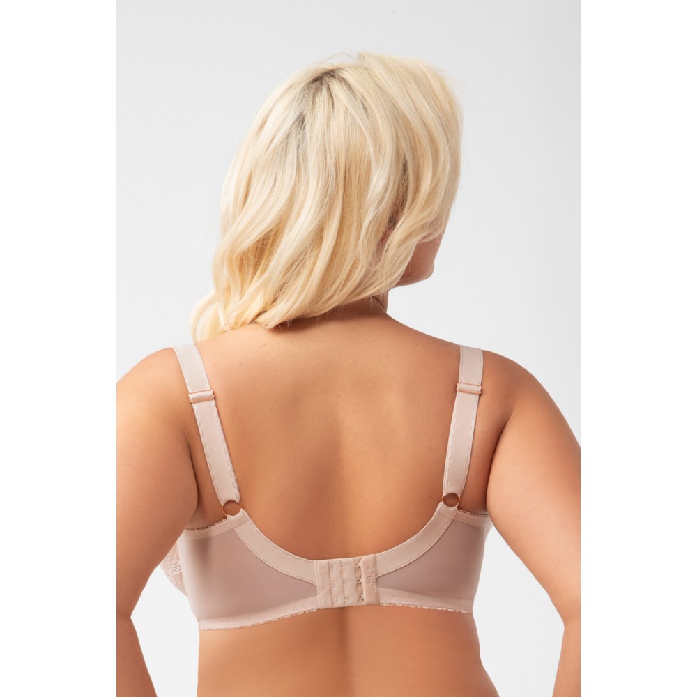 М'який бюстгальтер BIG Adore K930 бежевого кольору – ідеальний вибір для жінок із середнім, великим або дуже великим розміром грудей, які прагнуть одночасно елегантності та комфорту. Квіткове мереживо додає неповторного шарму, а сітчаста підкладка забезпечує тонку підтримку. Бічні кісточки ефективно запобігають скочуванню матеріалу, а різноманітна ширина бретелей підлаштовується під індивідуальні потреби, забезпечуючи максимальний комфорт.
