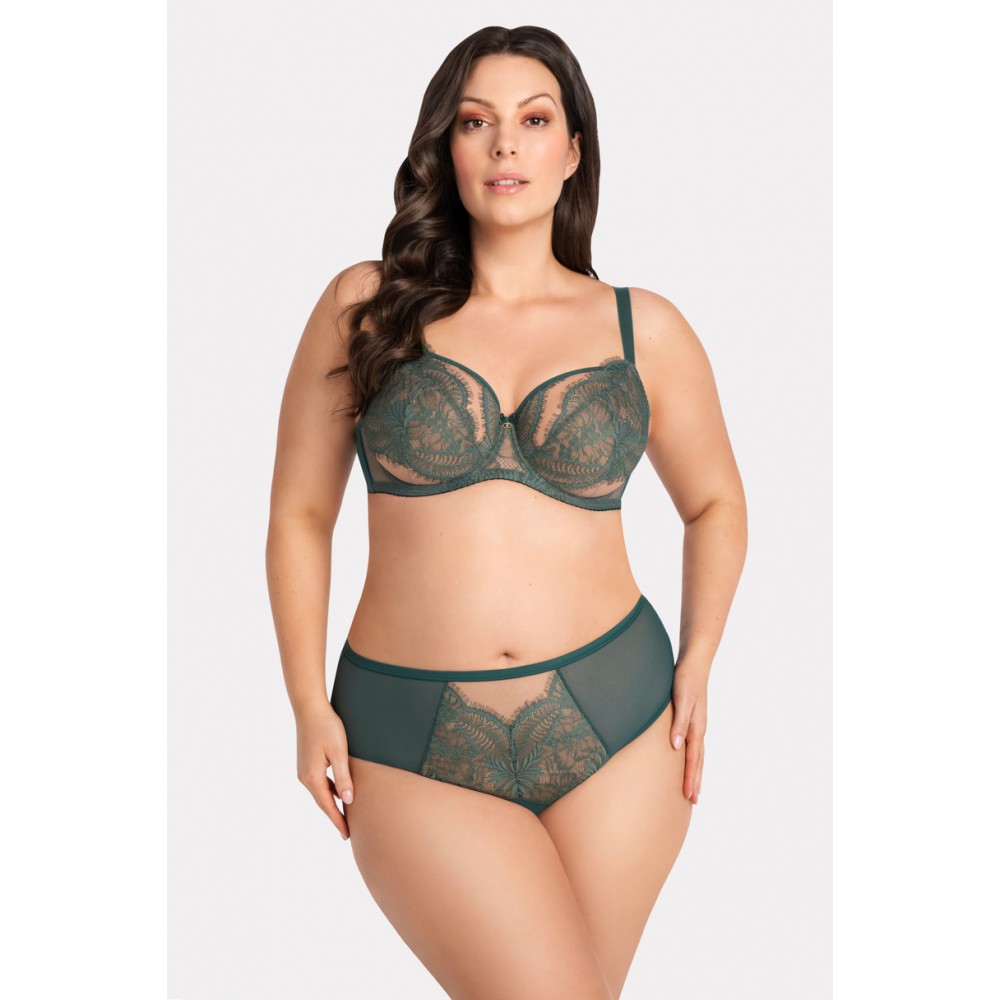 Biustonosz miękki przeznaczony dla kobiet ze średnim i dużym biustem. Zapewnia efekt uniesienia i zebrania biustu do środka, 3-częściowe miski wykonane ze stabilnej koronki z rzęskami i tiulu stabilnego. Górna krawędź miski przechodzi płynnie do ramiączka powodując lepsze podtrzymanie biustu. Tył z transparentnej lycry zapewniającej bardzo dobre dopasowanie i podtrzymanie. Fiszbiny boczne zapobiegające zwijaniu się materiału. W zależności od rozmiaru dwu lub trzyrzędowa haftka z trójstopniową regulacją obwodu. Nieodpinane, regulowane ramiączka w trzech szerokościach. Metalowe elementy w kolorze jasnego złota.