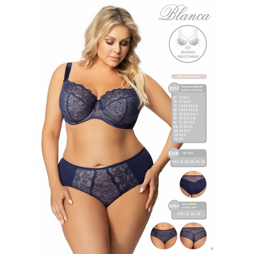 Klasyczny stanik półusztywniany o konstrukcji wzmocnionej fiszbinami. Miski biustonosza uszyte z koronkowej dzianiny. Boczki z elastycznego i gładkiego materiału. Ramiączka z regulacją długości, nieodpinane. Skład: 90% poliamid, 7% elastan, 3% poliester.