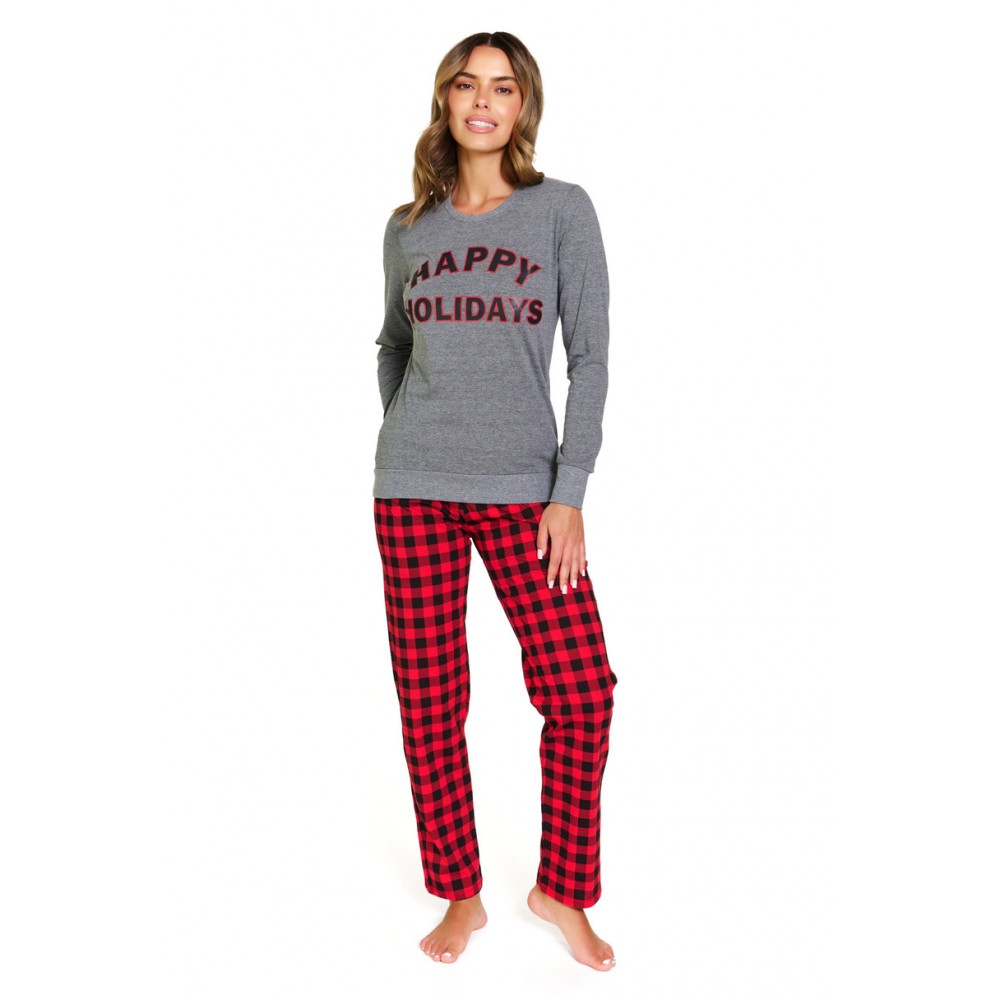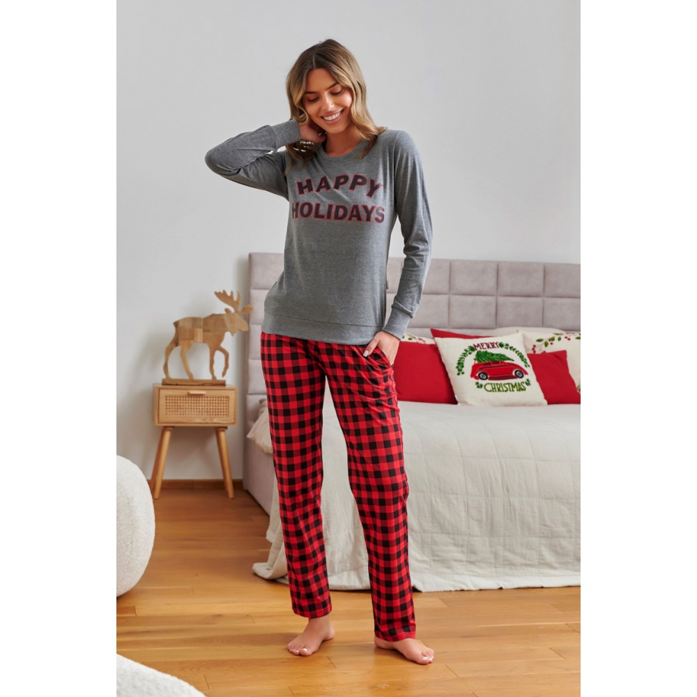 Піжамний топ має блузку з довгими рукавами та ребристими манжетами , прикрашену модним принтом спереду, що надає виробу жіночності. Довгі прямого крою картаті штани ідеально доповнюють топ, створюючи класичний, але водночас сучасний ансамбль.