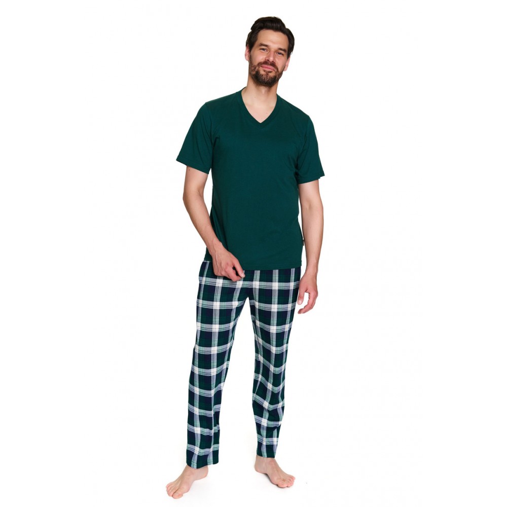 Верхня частина піжами – це футболка з короткими рукавами та V-подібним вирізом , що забезпечує комфорт та вільну посадку. Комплект постачається з довгими штанами в модний картатий візерунок , що надає всьому комплекту стильного та позачасового вигляду.