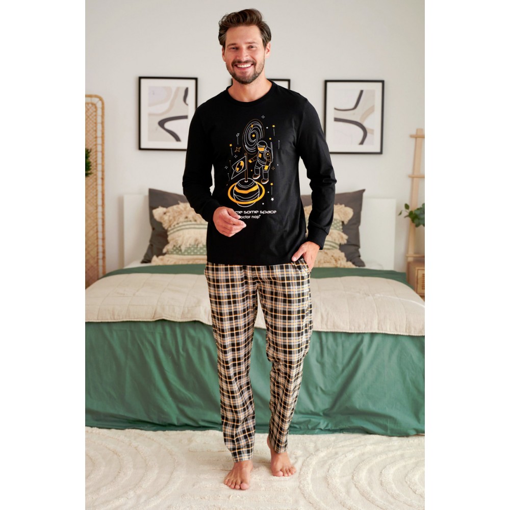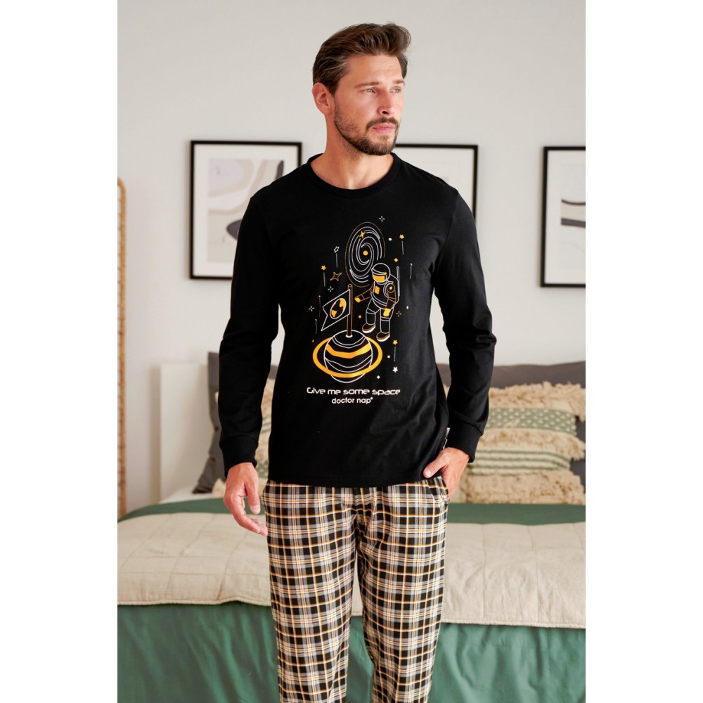 Чоловіча піжама з високоякісної м'якої бавовни. Футболка з довгими рукавами має принт на грудях. Довгі штани в клітинку з прямими штанинами та кишенями.