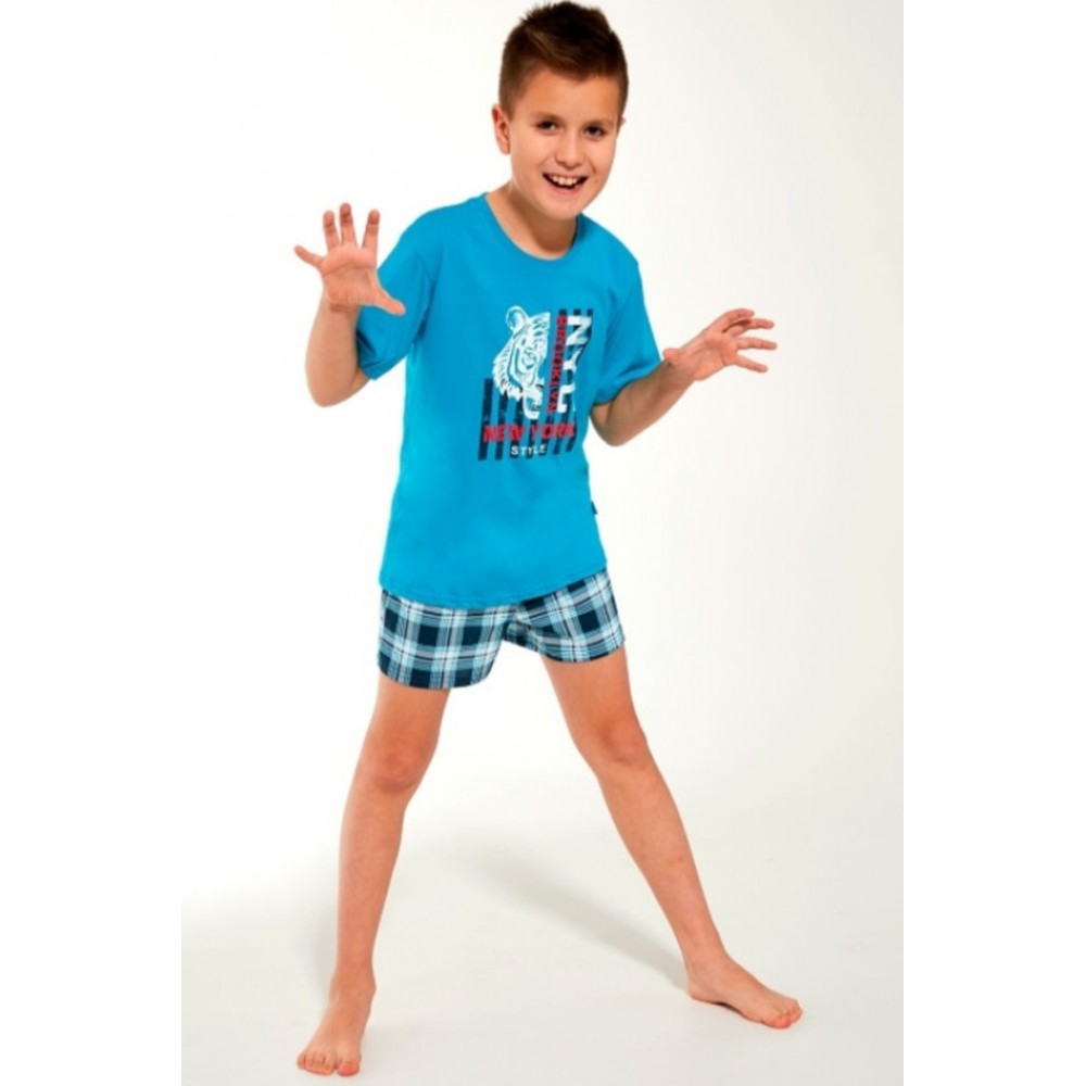 Бавовняна піжама для хлопчика, футболка з короткими рукавами та принтом, а також шорти в клітинку. Упаковано в пластик.
