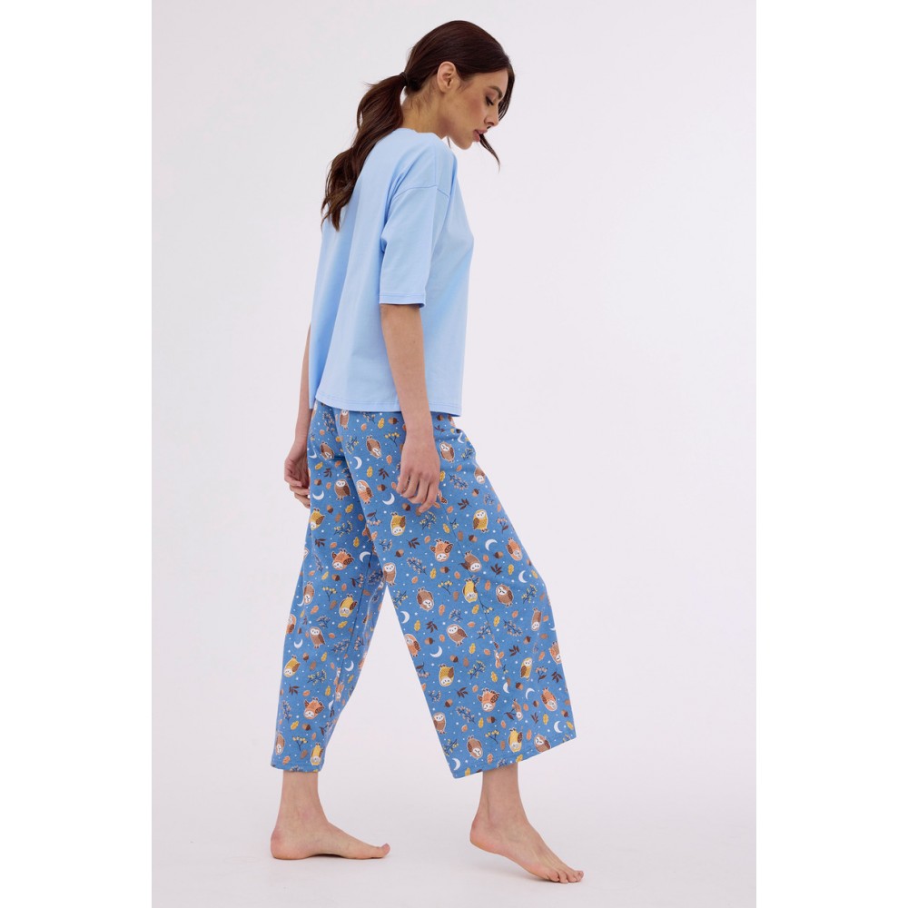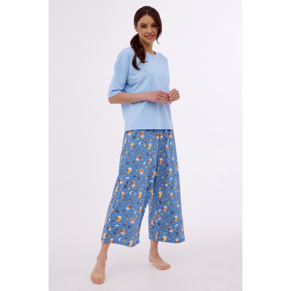 Жіноча однотонна піжама з рукавами 3/4 та нагрудною кишенею. Кюлоти з візерунком у тон.