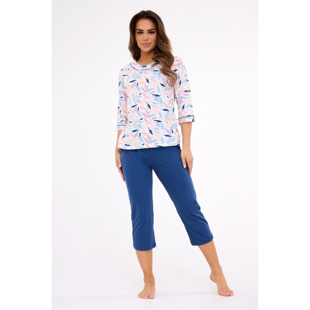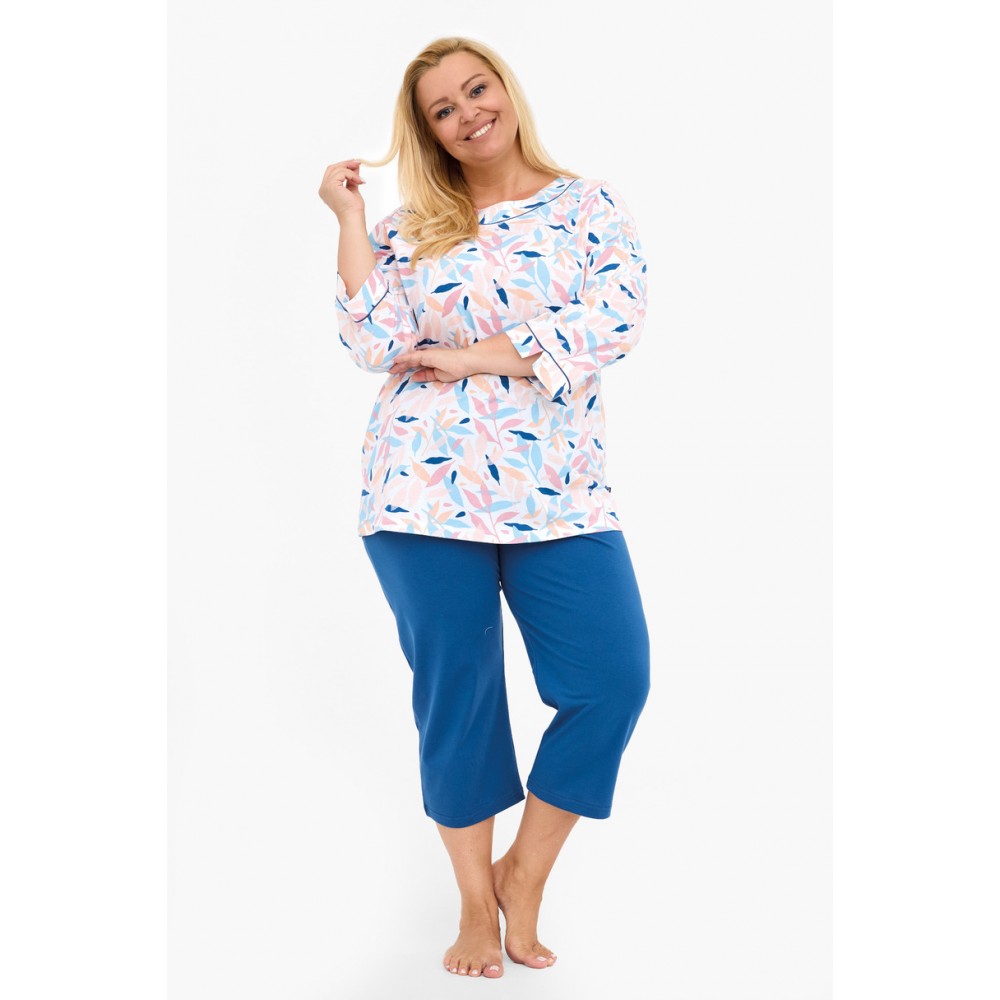 Жіноча піжама Cornette DR 732/452 Amelia 2 Big поєднує в собі класичний стиль, комфорт та жіночність. Верхній елемент - візерунчаста блузка з рукавами 3/4, ідеально підходить як для літа, так і для прохолодних вечорів. Комплект включає суцільні штани довжиною 7/8 з тієї ж високоякісної бавовни. Весь комплект виготовлений з натуральної, дихаючої тканини, що забезпечує повну свободу рухів та комфортний сон.
