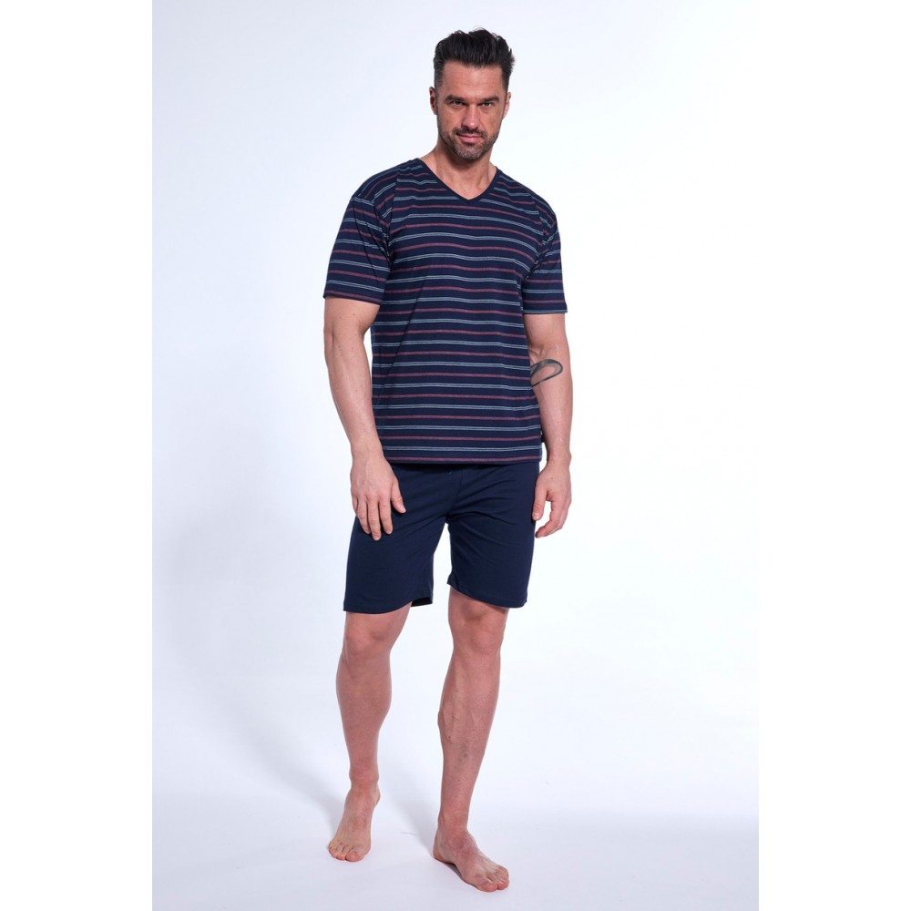 Чоловіча піжама з високоякісної м'якої бавовни. Футболка з короткими рукавами, у смужку та круглим вирізом. Однотонні шорти в тон. Упаковано в коробку.