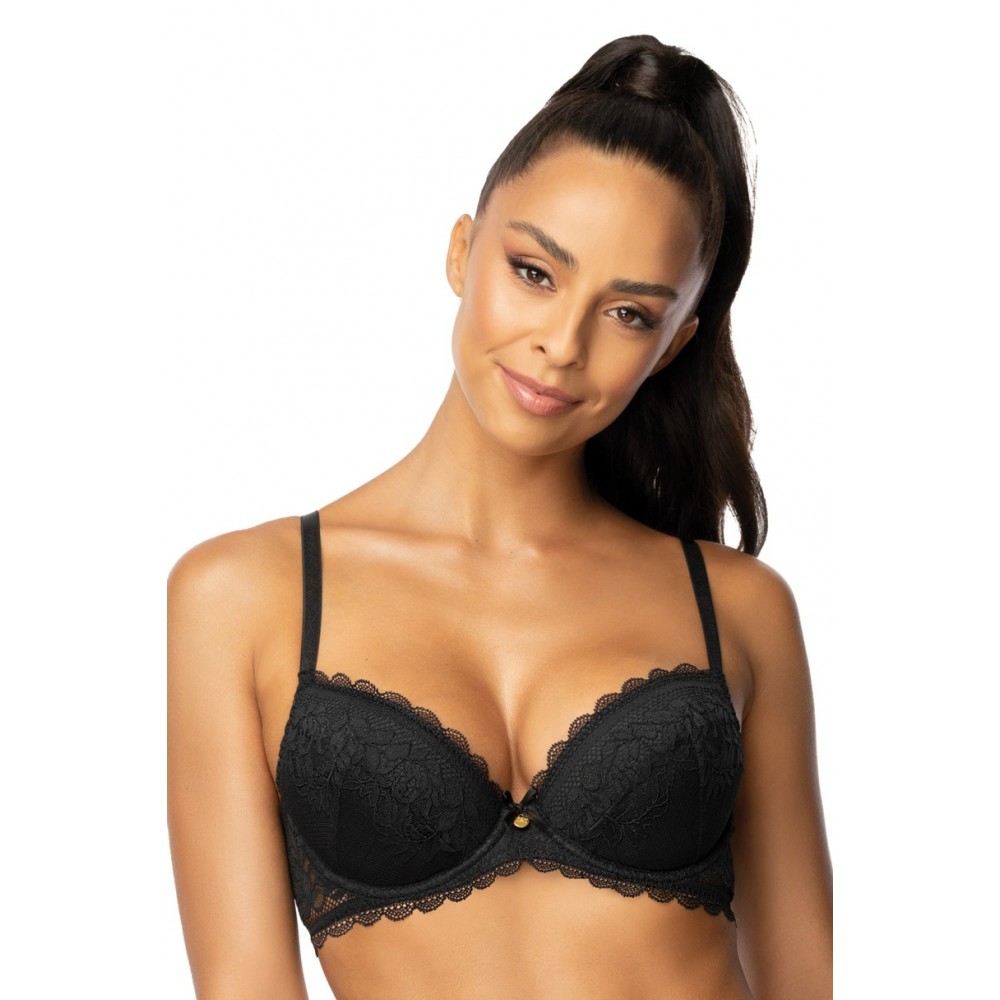 Цей бюстгальтер пуш-ап виготовлений з чорного мережива та ніжної сітки. Він має кісточки, знімні вкладки та регульовані незнімні бретельки. Бюстгальтер прикрашений коштовністю та бантом.