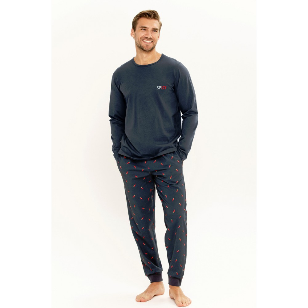 Чоловіча піжама з довгими рукавами, однотонного кольору та стриманим принтом на грудях. Довгі штани з візерунком, манжетами та кишенями в тон.