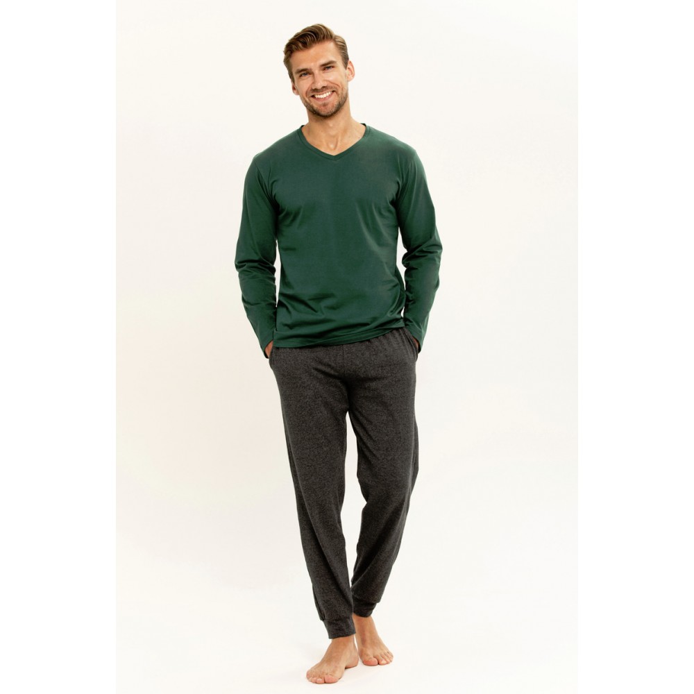 Чоловіча піжама з довгими рукавами, однотонного кольору, V-подібним вирізом. Меланжеві довгі штани в тон, з кишенями та ребристими манжетами.