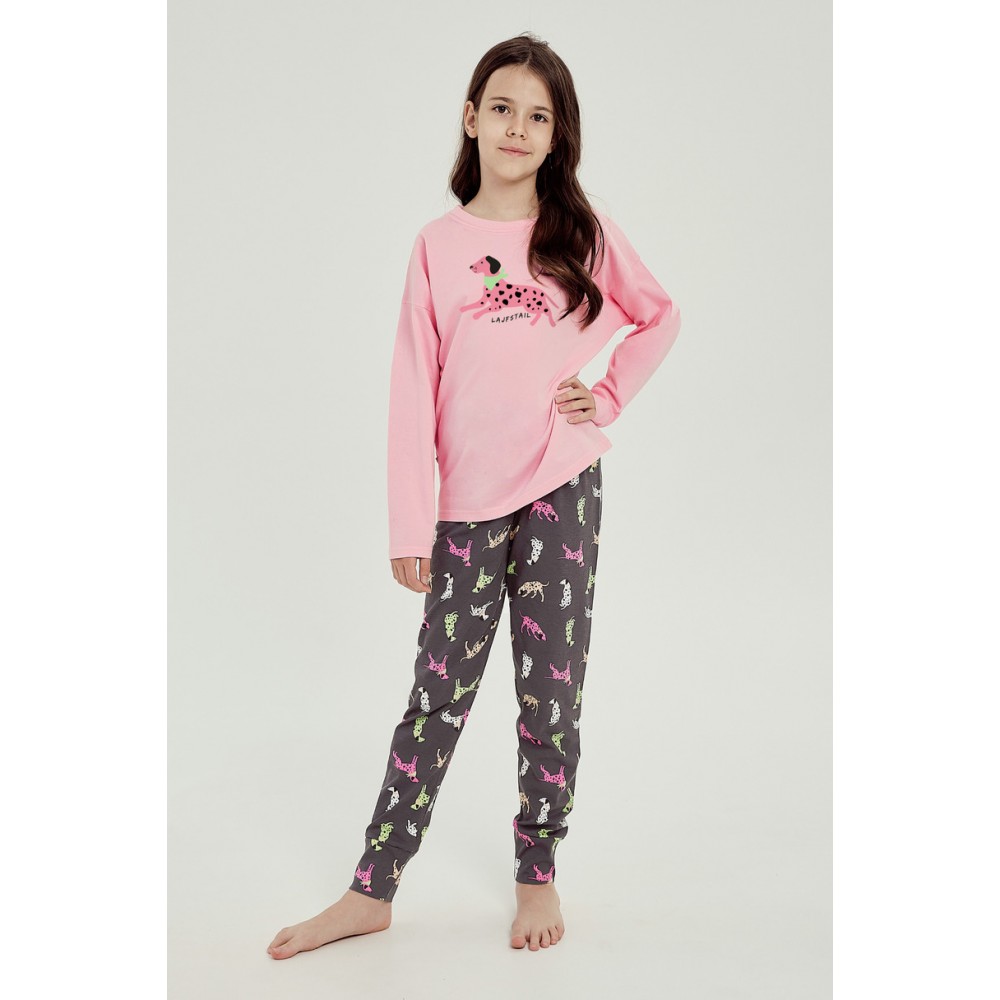 Піжама для дівчинки з м'якої високоякісної бавовни. Футболка з довгими рукавами та яскравим принтом спереду. Довгі штани з візерунком у тон.