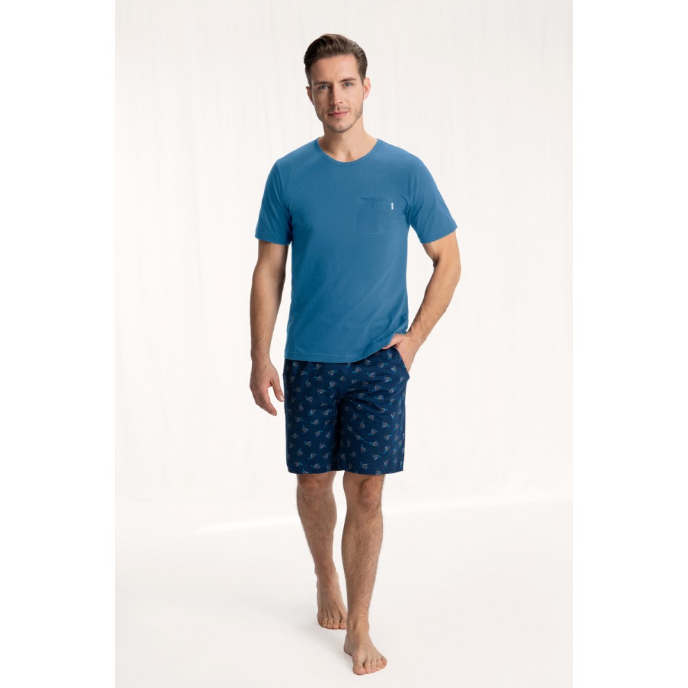 Чоловіча піжама Luna, короткі штани, принт, кишені. Однотонна футболка, круглий виріз горловини, нагрудна кишеня, короткі рукави.