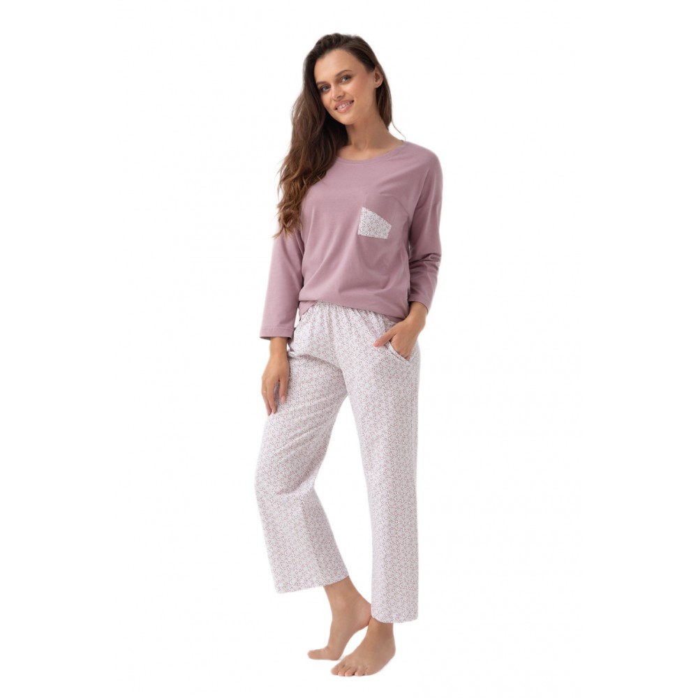 Жіночий піжамний комплект 339 J/25 – це зручний комплект, розроблений для жінок, які цінують витончений стиль та натуральні матеріали. Блузка кольору какао з рукавами 7/8 має кишеню з тим самим візерунком, що й штани, створюючи цілісний, естетично привабливий образ. Штани довжиною 7/8 з кишенями прикрашені ніжним бежевим мотивом розетки на екрю-фоні. Виготовлена зі 100% бавовни, піжама м’яка, дихаюча та ідеально підходить для будь-якої пори року.