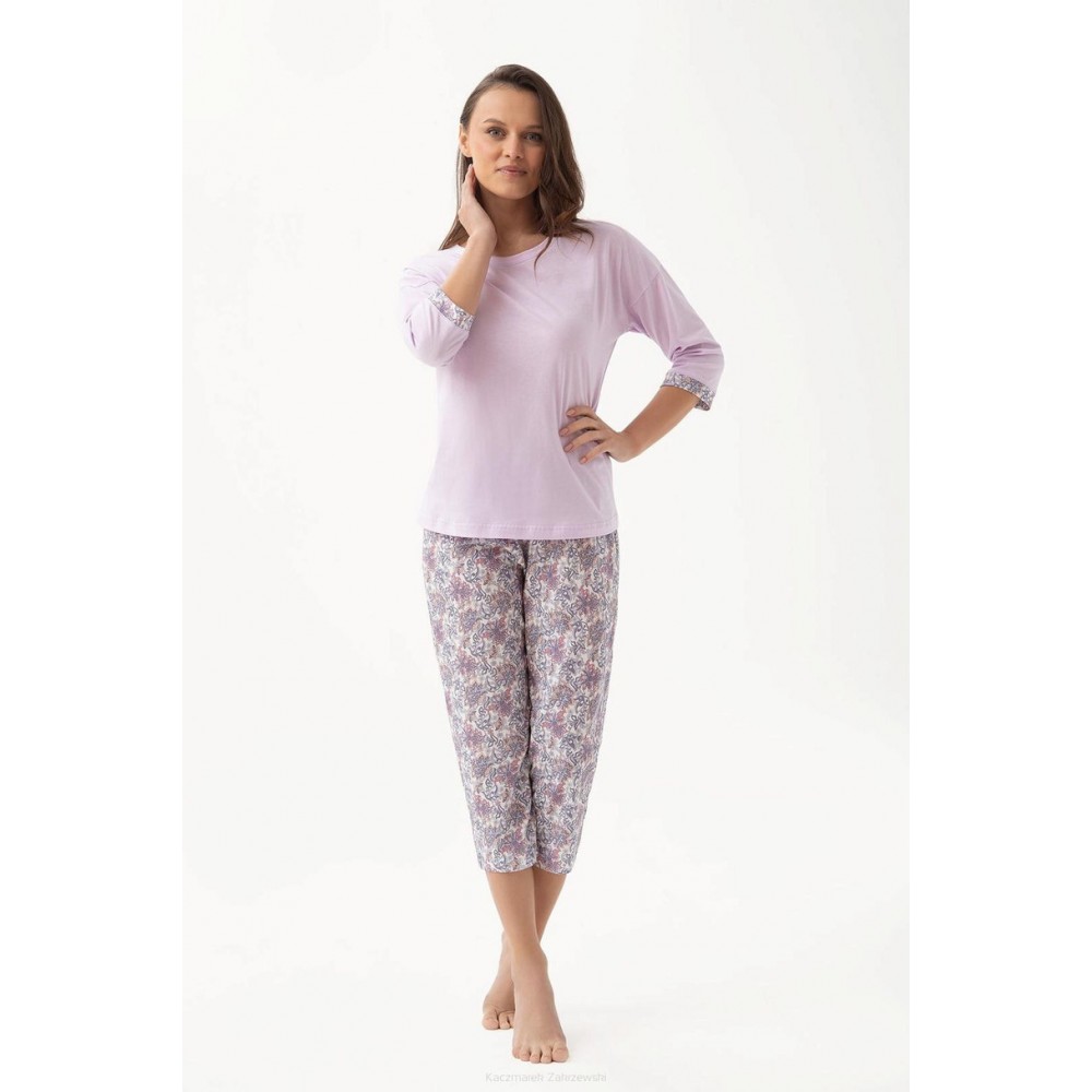Жіноча піжама Luna 343 J/25 поєднує класичний стиль із сучасним дизайном. Однотонний верх (вересовий або кремовий) має круглий виріз горловини та рукави 3/4 з принтованими в'язаними манжетами, що повторюють візерунок штанів. Штани 3/4 довжини також мають принт, створюючи гармонійний образ. Виготовлений зі 100% бавовни, комплект гарантує природну повітропроникність та комфортний сон. Ідеально підходить для будь-якої пори року.