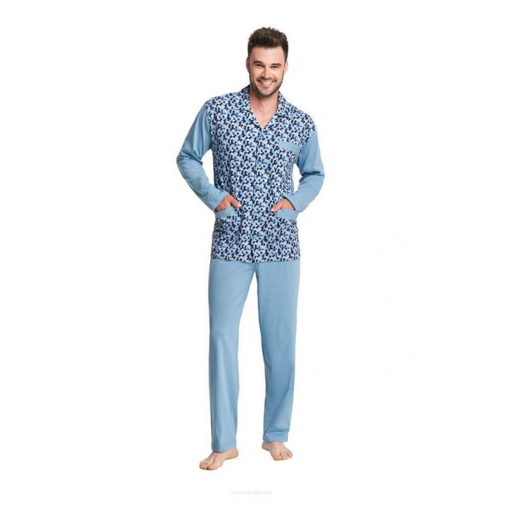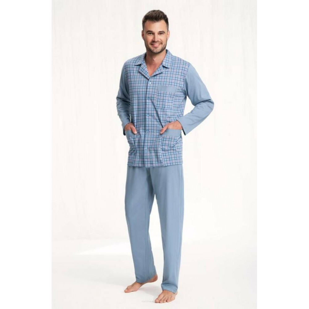 Чоловіча піжама з надзвичайно м'якої бавовни. Картата блузка на ґудзиках з коміром та кишенями. Довгі однотонні штани.