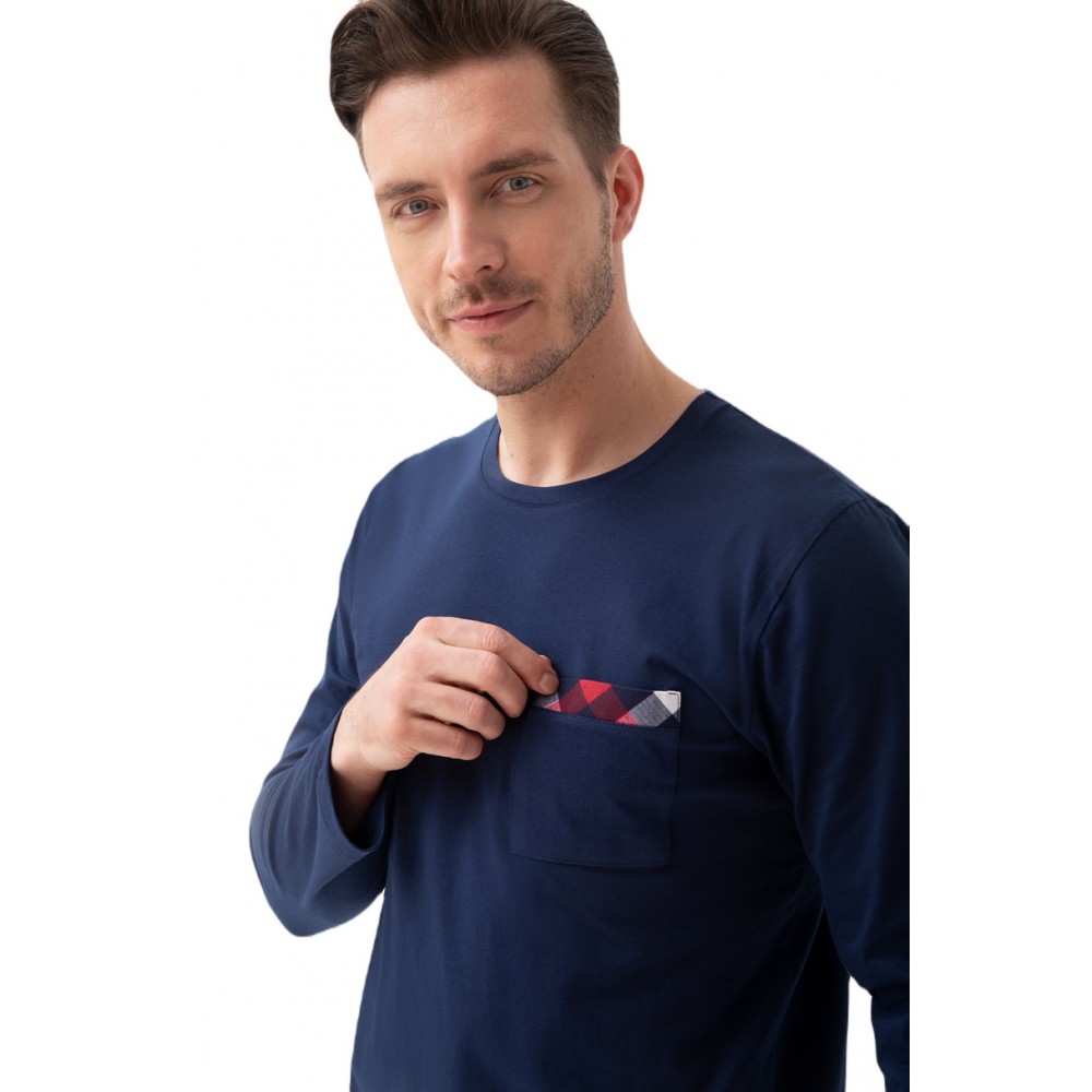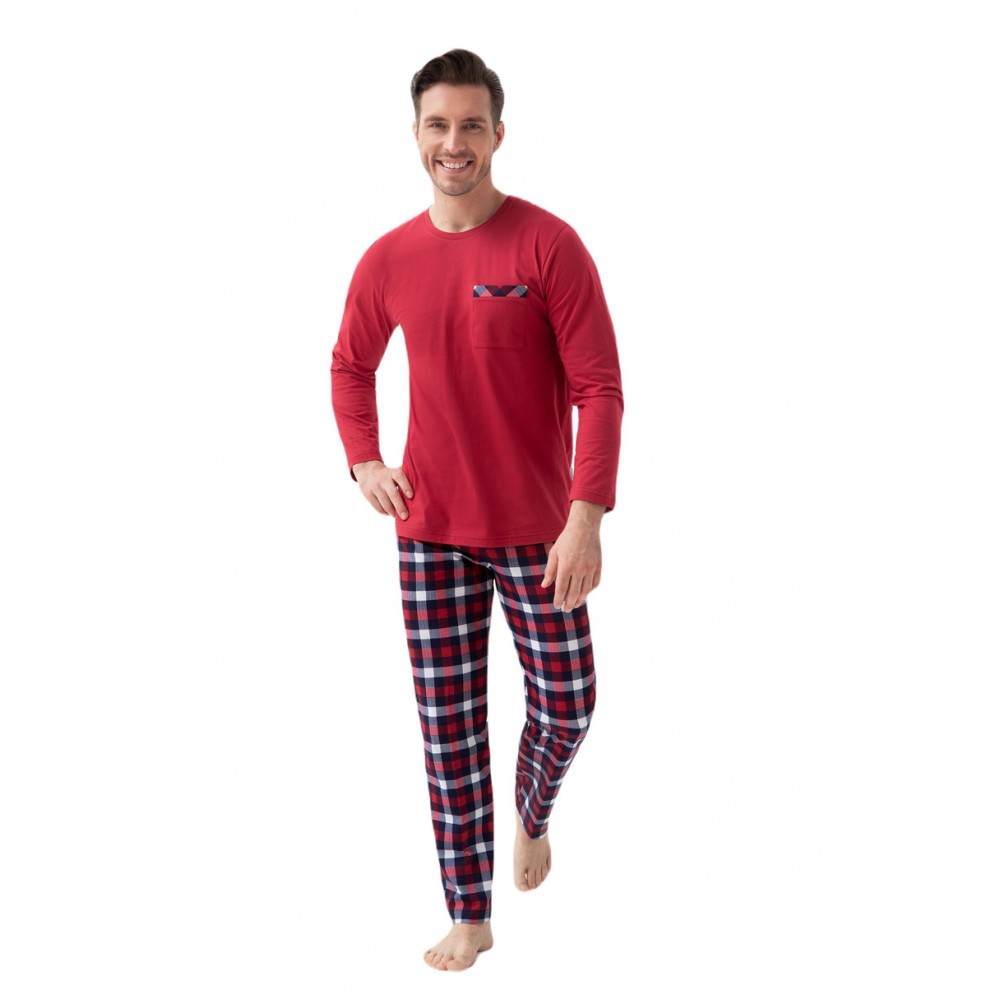 Чоловіча піжама з високоякісної бавовни. Светр з довгими рукавами та напівкруглим вирізом горловини. Ніжний принт та кишеня на грудях. Довгі, прямі, картаті штани в тон.