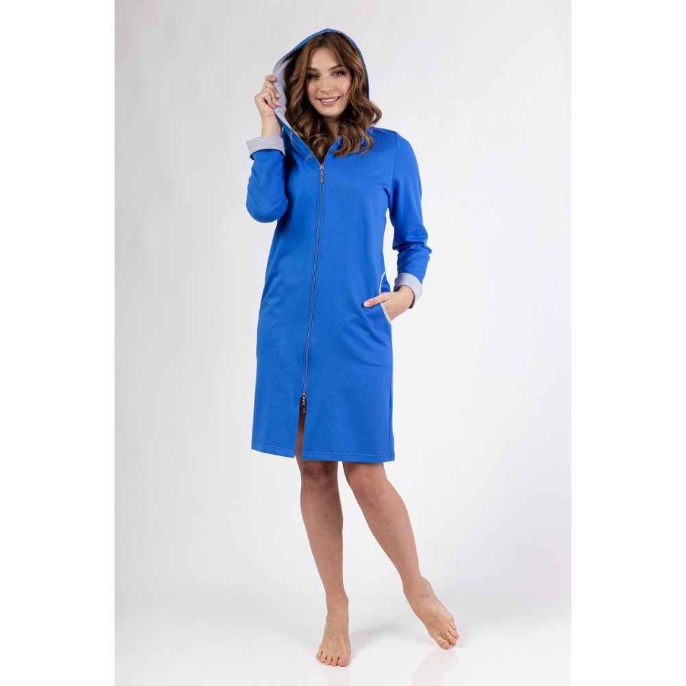 Жіночий короткий халат з капюшоном з легкої бавовни. Застібається на блискавку з кишенями на стегнах. Манжети та капюшон оздоблені контрастною бавовною.