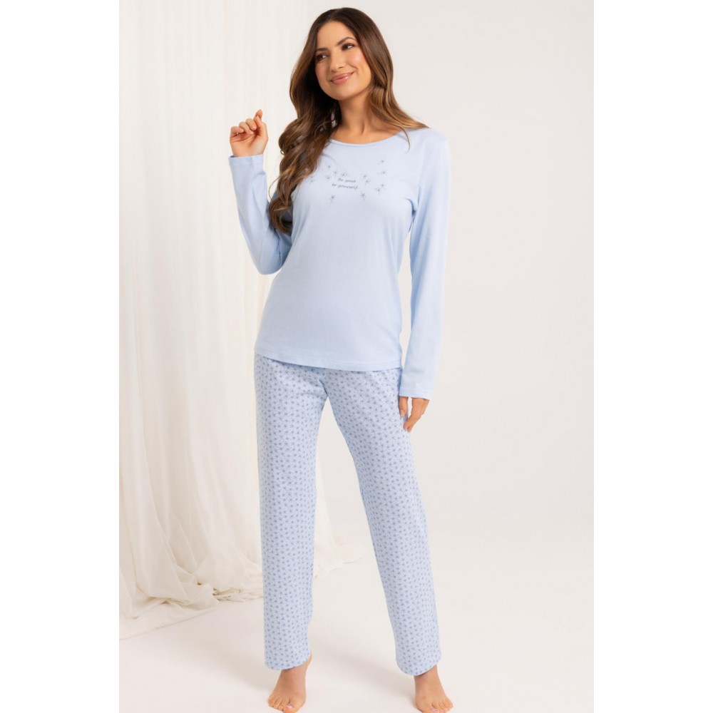 Жіноча піжама 708 BIG J/25 – ідеальний вибір для жінок, які цінують комфорт та витончений стиль. Виготовлена з високоякісної 100% бавовни, ця піжама м’яка, дихаюча та приємна для шкіри. Верх доповнений класичною футболкою з довгими рукавами, круглим вирізом та принтом спереду. Довгі штани вільного крою з візерунком доповнюють образ, забезпечуючи свободу рухів та комфорт протягом усієї ночі.