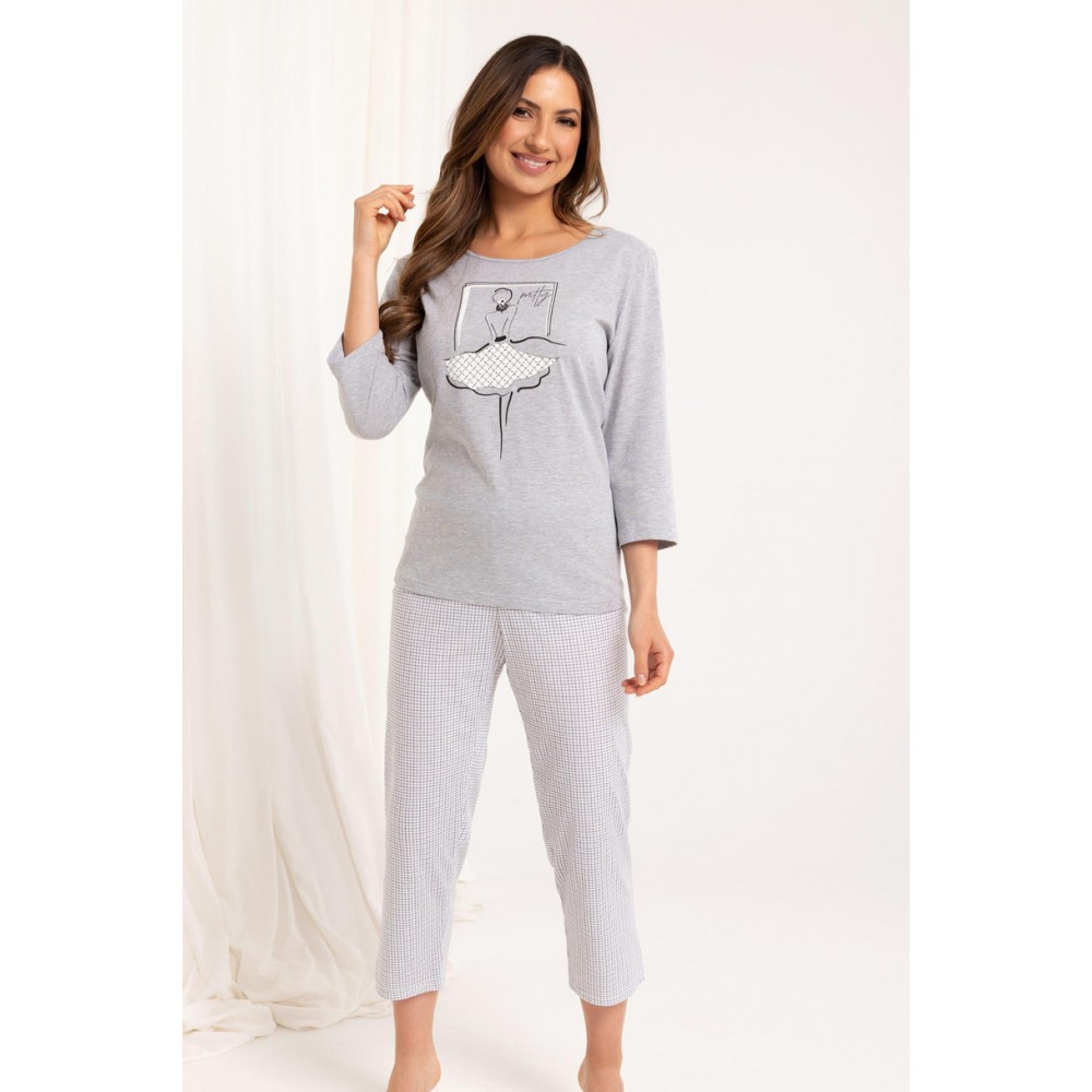 Жіноча піжама 716 J/25 – це стильний та зручний варіант, виготовлений з високоякісної 100% бавовни. Футболка з рукавами 3/4 та круглим вирізом горловини прикрашена ніжним принтом спереду, що надає виробу легкості та жіночності. Візерунчасті штани довжиною 7/8 ідеально доповнюють комплект. Натуральна тканина гарантує повітропроникність, м’якість та комфорт цілий рік – як для сну, так і для відпочинку вдома.