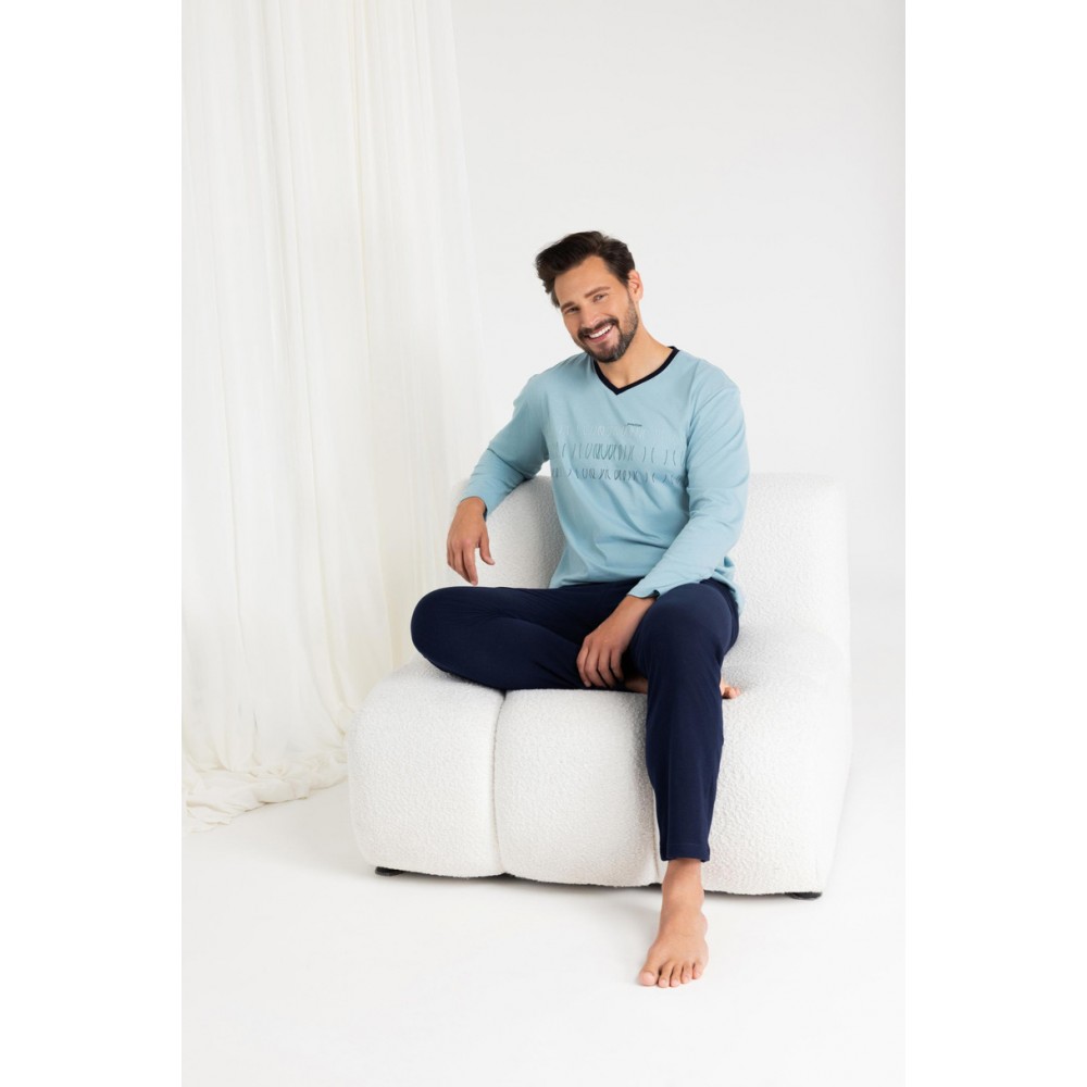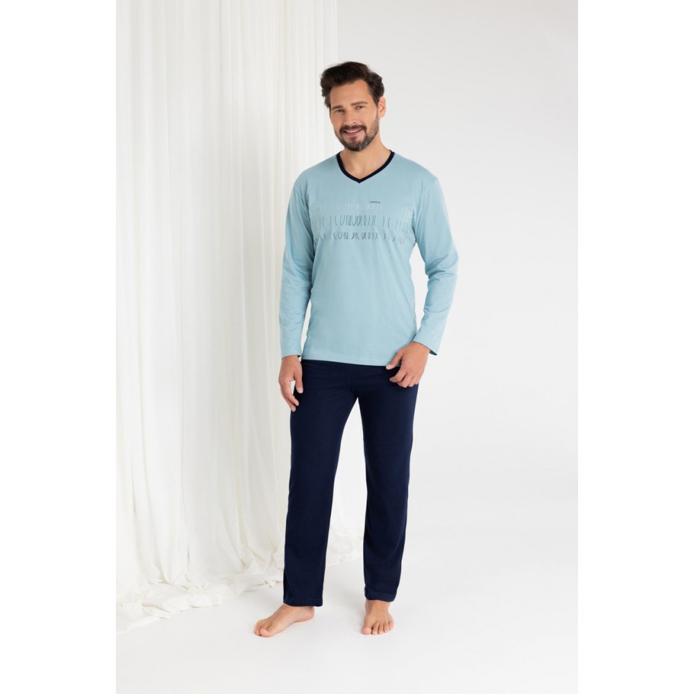 Ці чоловічі піжами 495 J/25 від відомого бренду Regina поєднують у собі класичний стиль, комфорт та якість. Виготовлені зі 100% м'якої, дихаючої бавовни, вони забезпечують комфорт та свободу рухів протягом усієї ночі. Футболка з довгими рукавами має V-подібний виріз та декоративний принт спереду, що надає їй сучасного вигляду. Довгі штани прямого крою доповнюють образ, створюючи практичний та стильний комплект для сну або відпочинку вдома. Ідеально підходять для прохолодних вечорів та ранків.