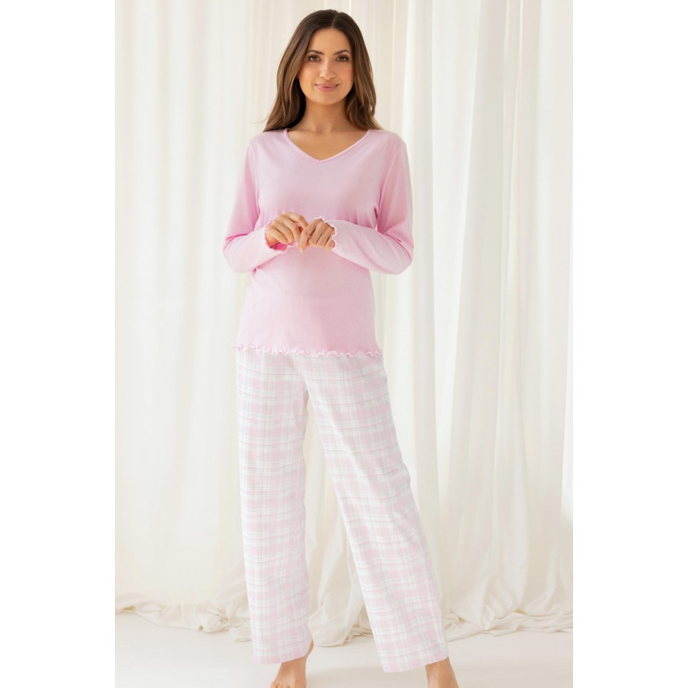 Жіноча піжама 712 J/25 поєднує в собі класичний крій з жіночними деталями. Виготовлена з високоякісної 100% бавовни, вона забезпечує повний комфорт і повітропроникність протягом усієї ночі. Однотонний топ з довгими рукавами має V-подібний виріз і тонкі манжети та поділ з фестонами, що надає йому ніжного, жіночного вигляду. Модні картаті штани з еластичним поясом з бавовняною обробкою ідеально облягають тіло, забезпечуючи комфорт і свободу рухів.