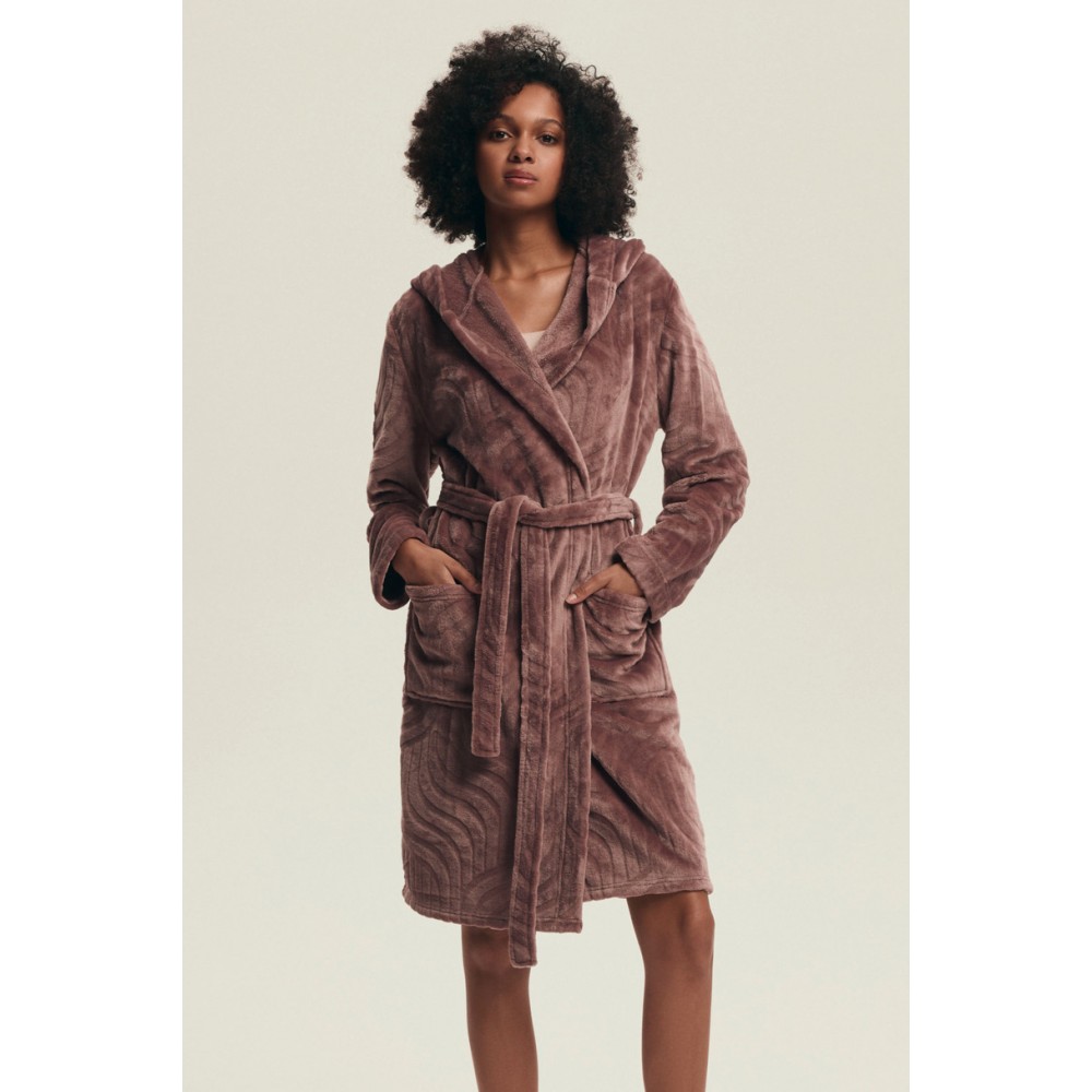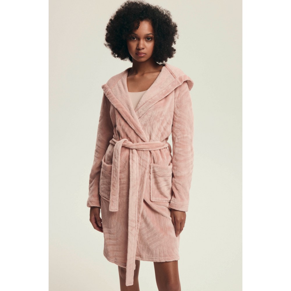 Жіночий халат DEVYN 43602 AW25 – ідеальний вибір для жінок, які цінують комфорт, елегантність та сучасний дизайн. Виготовлений з надзвичайно м’якої тканини з геометричним тисненням, він забезпечує затишне тепло та стильний вигляд. Маючи великий капюшон, місткі кишені та пояс на талії, він поєднує функціональність з витонченою жіночністю. Доступний у модних пудрових відтінках, він стане ідеальним супутником для ранку, вечора та моментів відпочинку вдома.
