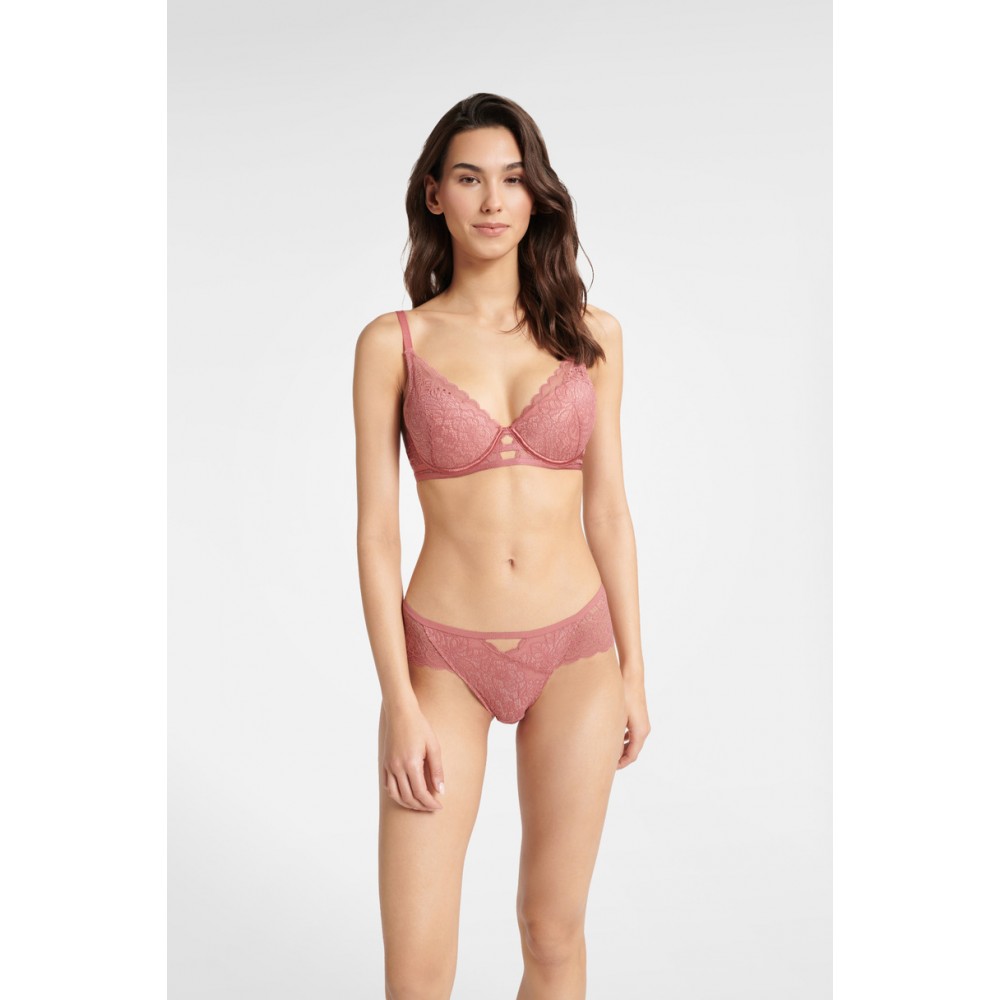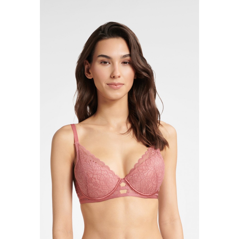 Класичний бюстгальтер з чашечками пуш-ап. Чашечки посилені кісточками. Прокладки знімні. Модель HINT має декоративні мереживні вставки, а чашечки покриті мереживом. Склад : Мереживо: 90% поліамід, 10% еластан. Сітка на крильцях: 94% поліамід, 6% еластан. Підкладка чашечки: 100% бавовна.