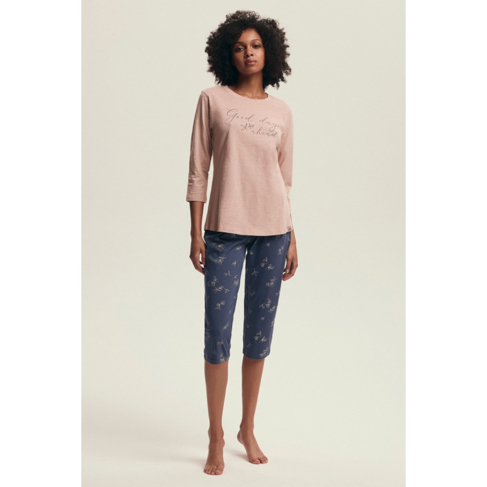Пудрово-рожева блузка з рукавами 3/4 прикрашена мінімалістичним принтом "Good days ahead" , що створює позитивний настрій як на початку, так і на кінці дня. Комплект містить темно-сині штани 3/4 з ніжним квітковим візерунком, що додають нотку легкості та жіночності.