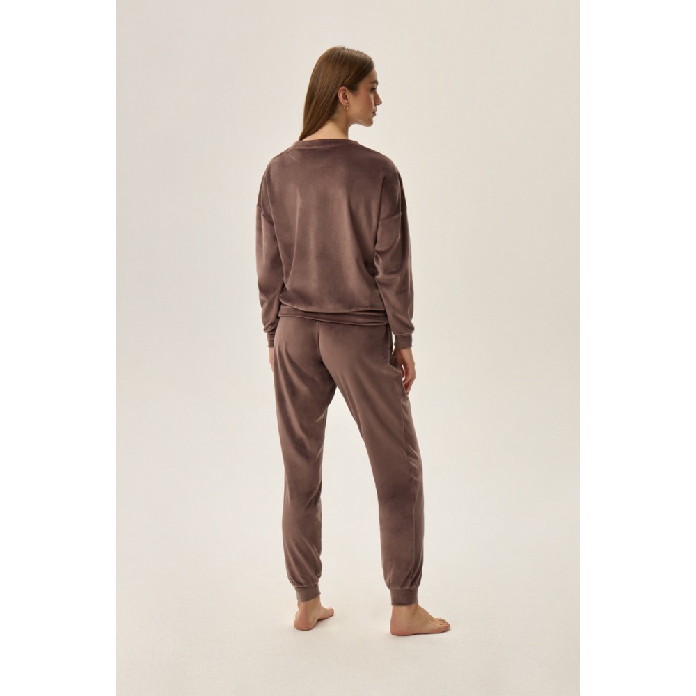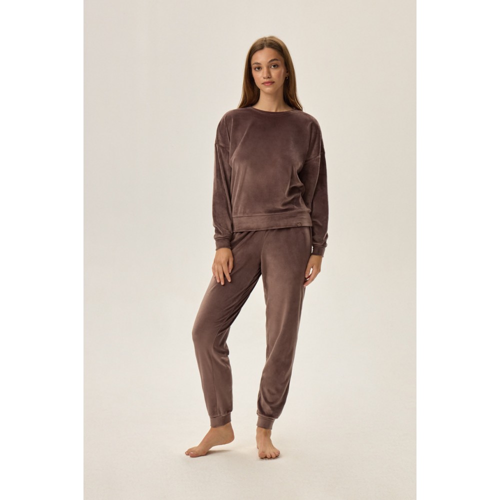 Dres damski z cienkiego weluru, idealny jako element codziennej stylizacji. Bluza z długim rękawem, dekolt półokrągły, spodnie długie. Dół bluzy, mankiety i nogawki zakończone ściągaczem. W talii wygodna, szeroka guma i troczek do regulacji obwodu pasa.