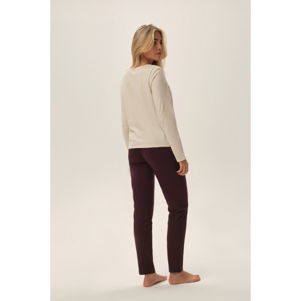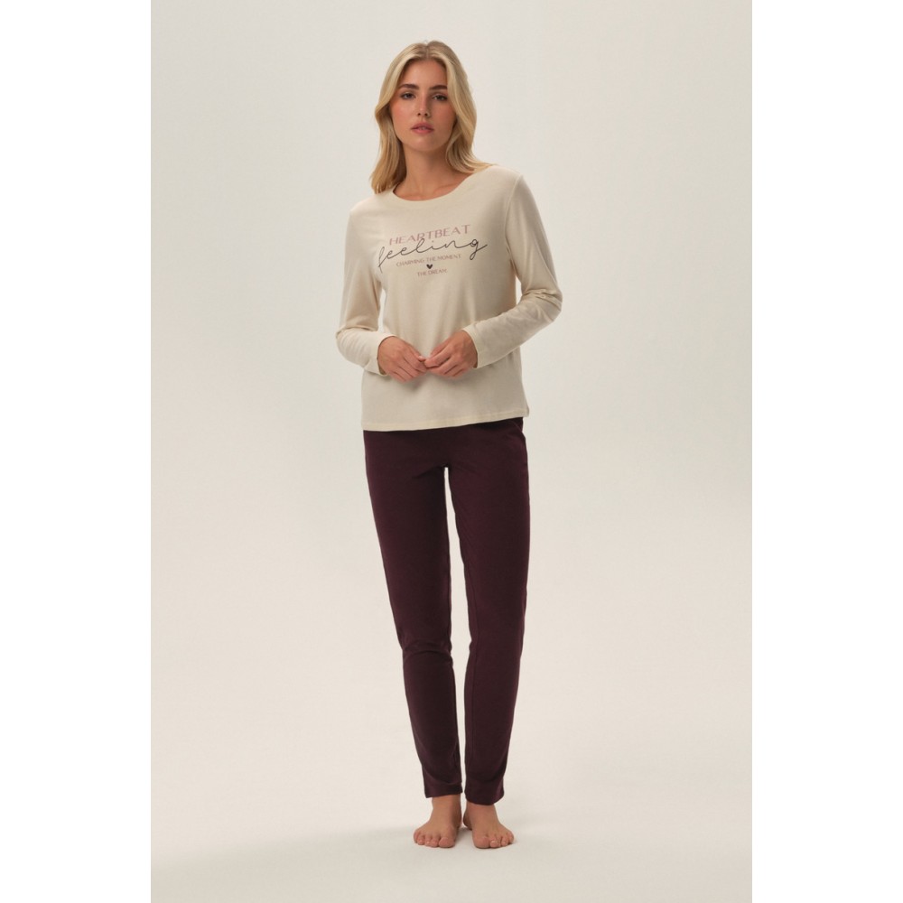 Жіноча піжама з м'якої бавовни. Футболка з довгими рукавами, довгі штани з візерунком. Круглий виріз горловини.