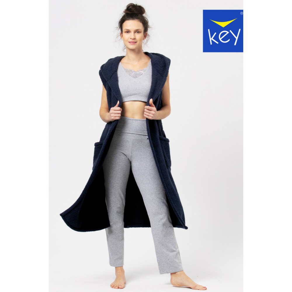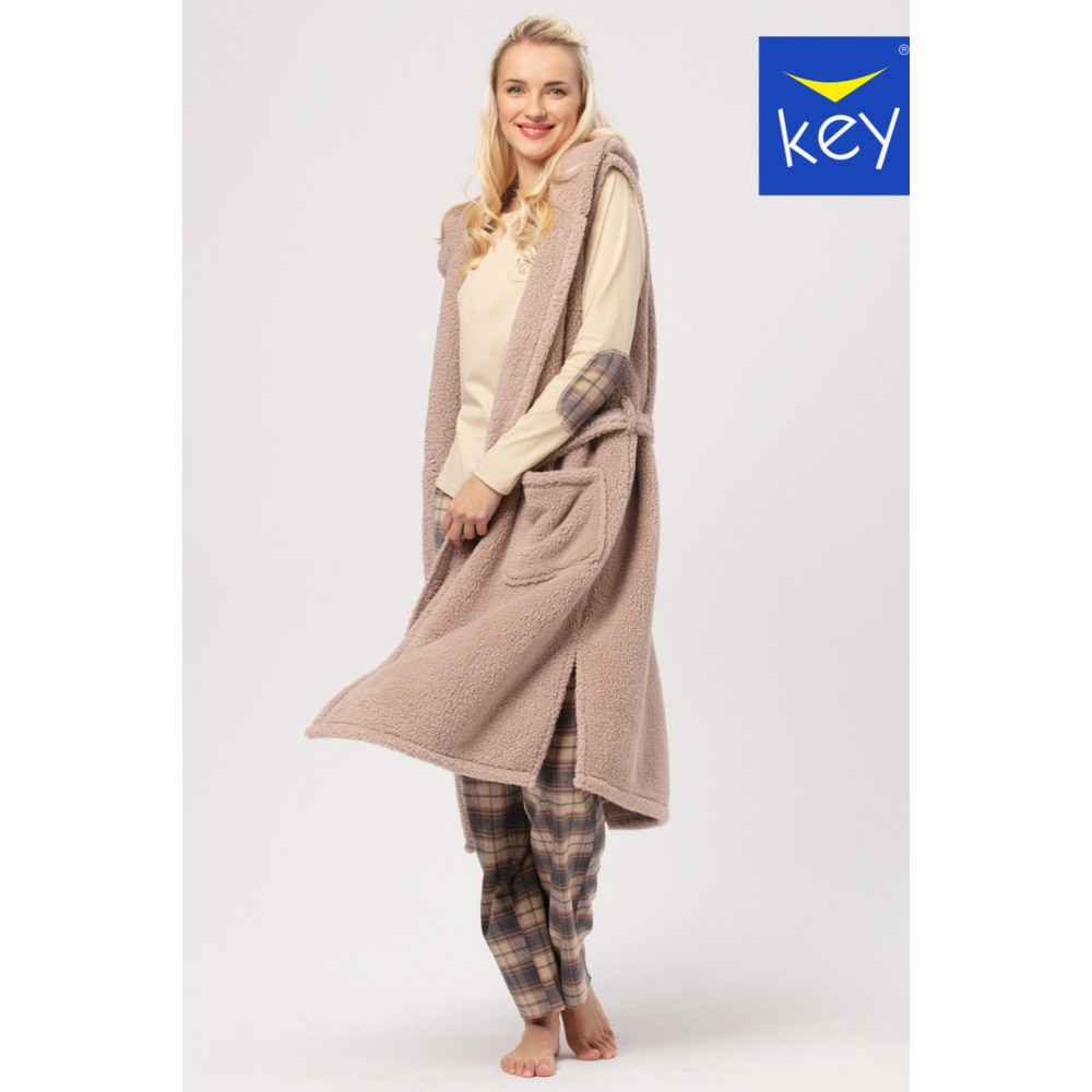 Długa kamizelka damska-homewear z miękkiej dzianiny o strukturze "baranka", wiązana w pasie, dwie zewnętrzne kieszenie, z kapturem