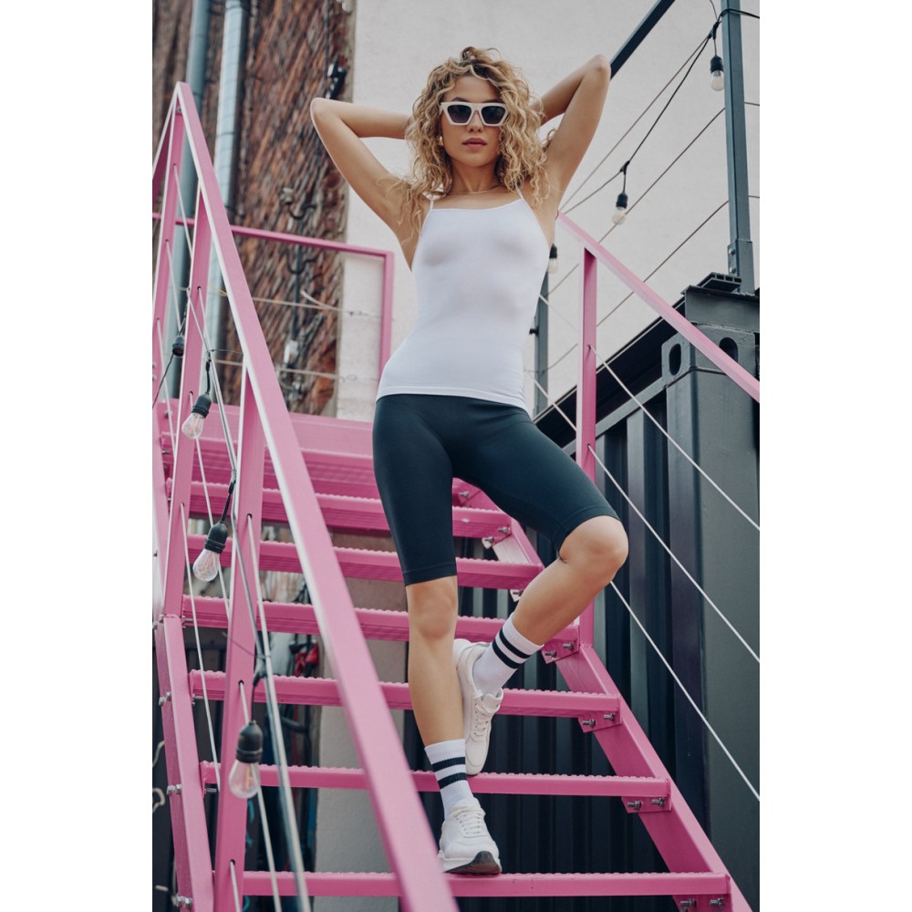 Ці непрозорі чорні безшовні шорти довжиною до колін – це модне та зручне доповнення до спортивного образу. Вони естетично облягають ноги, підкреслюючи жіночні вигини та візуально стрункішими стегна та сідниці. Облягаючі штанини не збиваються та не мнуться, а еластичний пояс, що не сковує рухів, забезпечує комфорт і тримає безшовні легінси на місці.