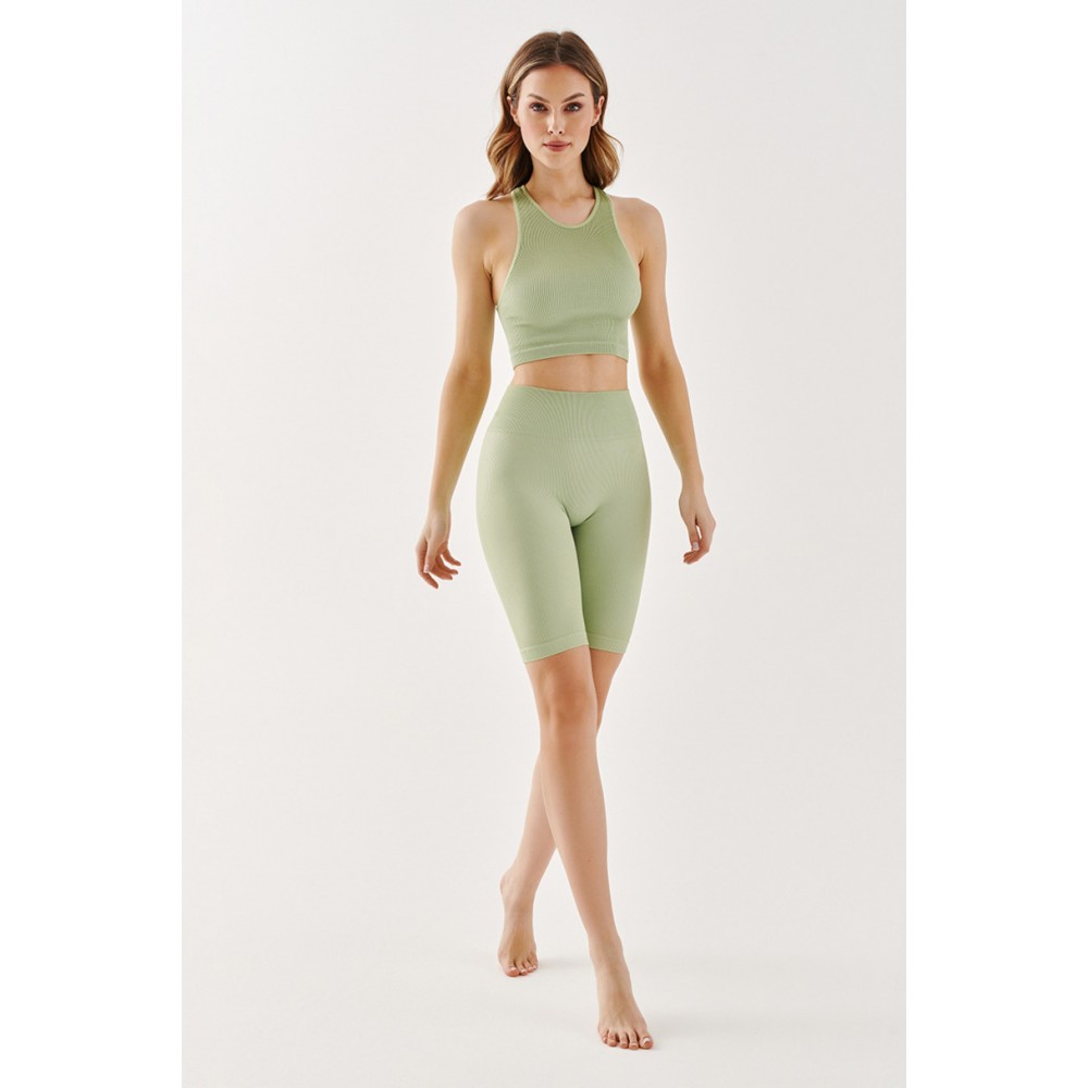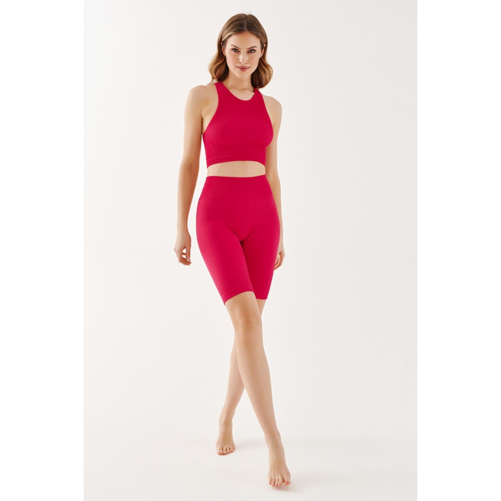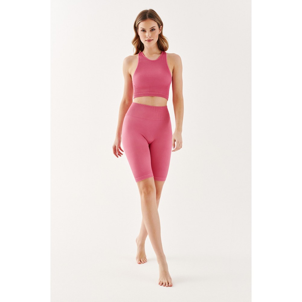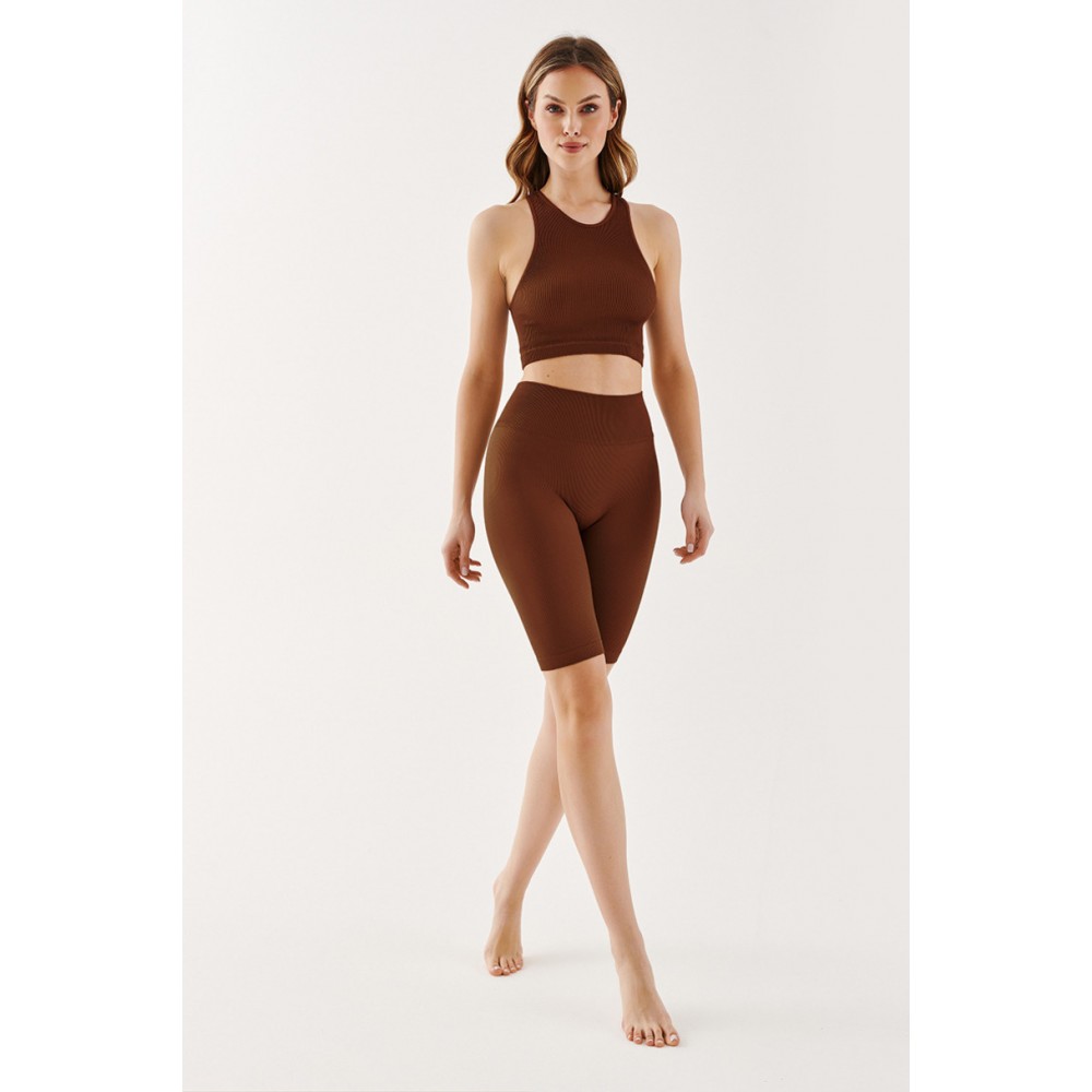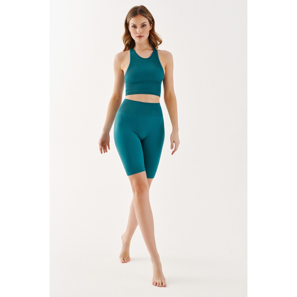Чорні, непрозорі, безшовні шорти до колін – це модне та зручне доповнення до спортивного образу. Легінси з тонкими вертикальними смужками естетично облягають ноги, підкреслюючи жіночні вигини та візуально стрункішими стегна та сідниці. Облягаючі штанини не збиваються та не мнуться, а еластичний пояс, що не сковує рухів, забезпечує комфорт. носить легінси та тримає їх на місці.