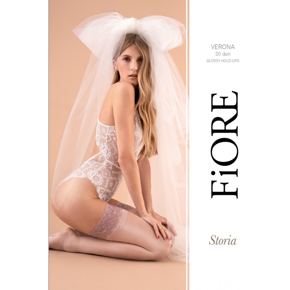Високоякісні фіксуючі панчохи. Ідеально підходять для весіль та інших особливих подій. Ніжний нюдовий колір доповнює будь-який тон шкіри. Стегна підкреслені пудрово-рожевим мереживом з лініями кольору баклажана.